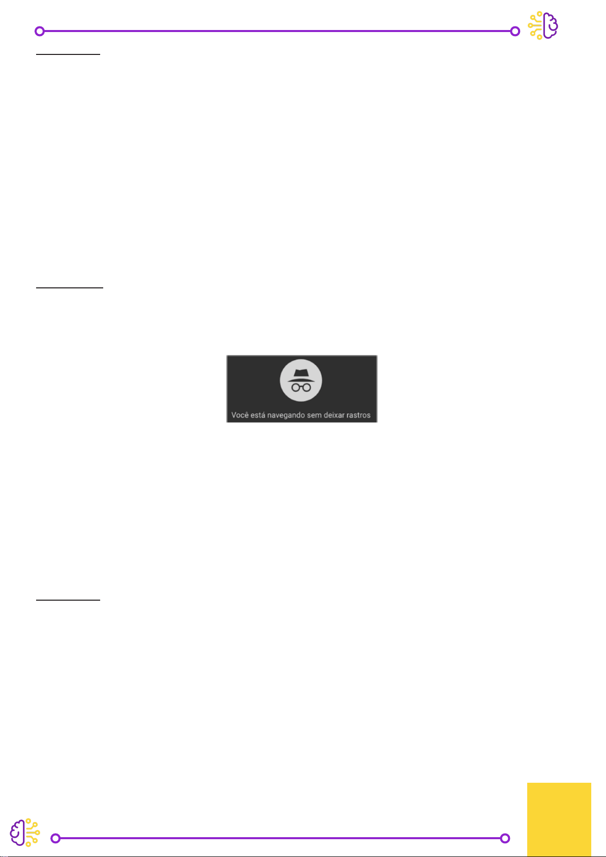 117 Questão 294: FCC - AFRE GO/SEFAZ GO/2018 Um usuário do Google Chrome sabe que, por padrão, os arquivos baixados da internet são gravados na pasta Downloads de computadores que utilizam o sistema operacional Windows. Porém, esse usuário deseja que, toda vez que um arquivo for baixado, seja questionado em qual local ele deseja salvá-lo. Para isso, ele deverá clicar no botão “Personalizar e controlar o Google Chrome”, depois selecionar a) Downloads > Definir local e ativar “Definido pelo usuário”. b) Configurações > Avançado e, no grupo Downloads, ativar “Perguntar onde salvar cada arquivo antes de fazer download”. c) Preferências > Avançado > Downloads e ativar “Perguntar antes de salvar”. d) Downloads > Avançado e, no grupo Definir Local, ativar “Perguntar onde salvar cada arquivo antes de fazer download”. e) Configurações > Downloads e ativar “Permitir a escolha do local”. Questão 295: FGV - Ass Leg (ALERO)/ALERO/Técnico em Informática/2018 No Google Chrome, é possível navegar com privacidade sem salvar o histórico de navegação, cookies e informações fornecidas em formulários. Esse tipo de navegação é indicado pela mensagem ilustrada a seguir. Assinale a opção que indica o recurso utilizado pelo Google Chrome para navegar na Web com privacidade no modo sem rastros. a) A sincronização com dispositivos. b) O bloqueio de pop-ups. c) A navegação anônima. d) O perfil supervisionado. e) O isolamento de site. Questão 296: FCC - Estag (SABESP)/SABESP/Ensino Médio Regular/2017 Considere que um usuário esteja utilizando o navegador Google Chrome em condições ideais e digitou o seguinte comando na linha de endereço: chrome://history Este comando a) lista todos os sites que o usuário navegou na internet nos 3 últimos dias apenas. b) lista apenas os sites que o usuário adicionou aos Favoritos e informa o dia e horário de acesso. c) dá acesso ao histórico, informa o dia, mas não informa o horário de acesso aos sites. d) dá acesso ao histórico e oferece a opção "Limpar dados de navegação". e) dá acesso ao histórico, mas não permite que apenas uma parte dos sites listados sejam removidos. Licenciado para - sara aparecida de souza consoli - 33544593874 - Protegido por Eduzz.com