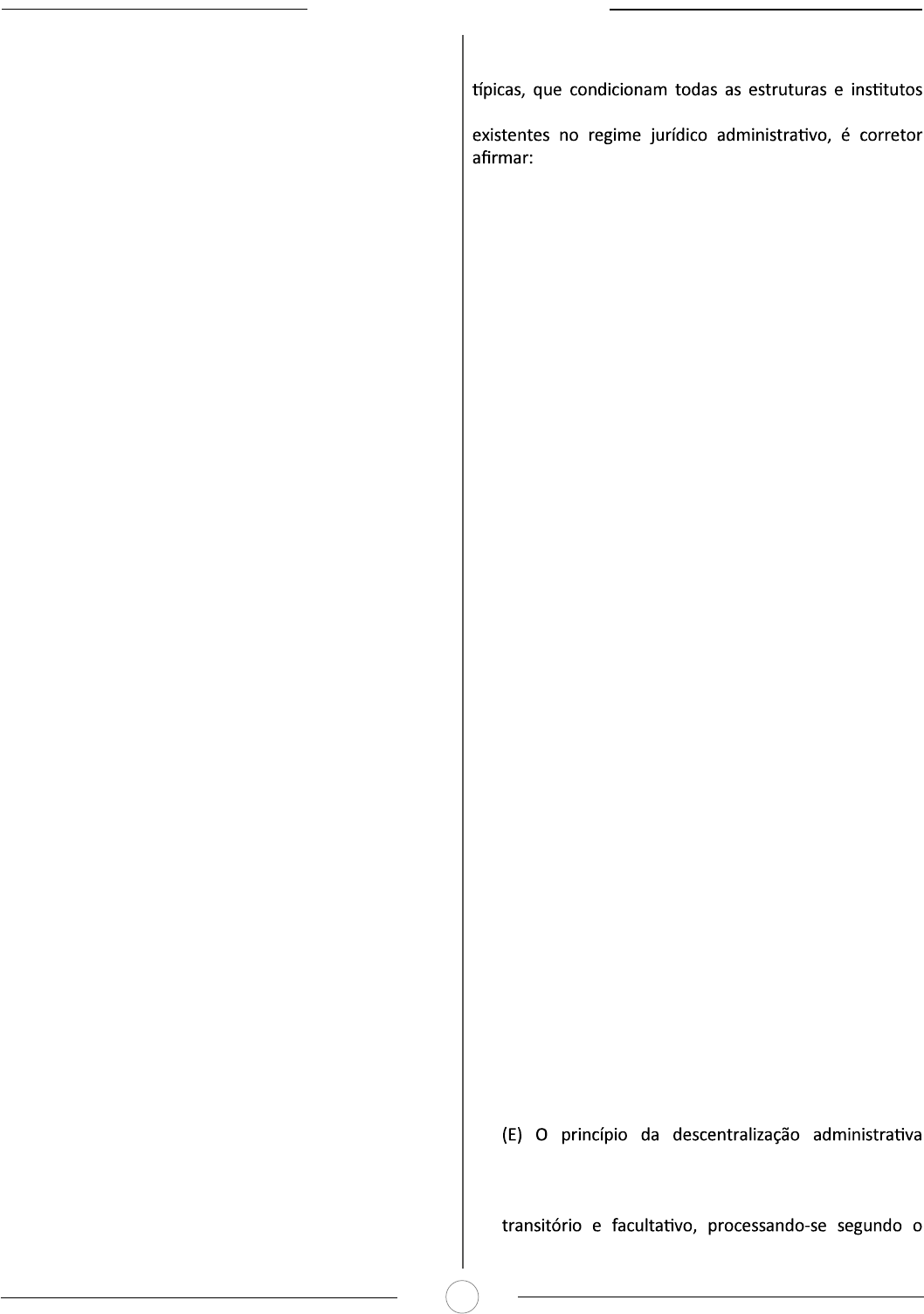 DIREITO ADMINISTRATIVO 4 14. VUNESP - Agente (CM Boituva)/ Administrativo/2020 A transparência na administração pública é um dos princípios fundamentais da democracia e, apesar de não estar explicitada no caput do artigo 37 da Constituição Federal de 1988, tem como um dos seus principais componentes o princípio constitucional da (A) publicidade. (B) eficiência. (C) legalidade. (D) eficácia. (E) moralidade. 15. VUNESP - Jornalista (CM Mogi Mirim)/2020 O Art. 37 da Constituição Federal de 1988 explicita cinco princípios que devem ser observados pela administração pública direta, indireta e fundacional de qualquer dos Poderes da União, dos Estados, do Distrito Federal e dos Municípios. Entre eles, há o que determina que “todo e qualquer ato da Administração Pública deve atender ao objetivo ao qual se destina sem deixar nenhuma espécie de “marca””. (jus.com.br. Disponível em https://bit.ly/33iZkvS. Acesso em 13.03.2020. Adaptado) O princípio que determina essa atitude da administração pública é chamado de Princípio da (A) Legalidade. (B) Impessoalidade. (C) Moralidade. (D) Publicidade. (E) Objetividade. 16. VUNESP - Analista de Benefícios Previdenciários (VALIPREV)/2020 A Administração não tem a livre disposição dos bens e interesses públicos, porque atua em nome de terceiros. Por essa razão é que os bens e interesses públicos só podem ser alienados conforme o disposto em lei. Da mesma forma, os contratos administrativos reclamam, como regra, que se realize licitação para encontrar quem possa executar obras e serviços de modo mais vantajoso à Administração. É correto afirmar que o texto do enunciado se refere ao princípio da (A) indisponibilidade. (B) autotutela. (C) moralidade. (D) continuidade dos serviços públicos. (E) segurança jurídica. 17. VUNESP - Procurador Jurídico (CM Pindorama)/2020 Princípios são proposições básicas, fundamentais, subsequentes de uma disciplina. Sobre os princípios (A) no Direito Administrativo pátrio não são admitidos princípios implícitos. (B) os princípios mínimos de Direito Administrativo são aplicáveis à Administração Direta e à Indireta, exceto quando exploradora de atividade econômica. (C) o princípio da supremacia determina privilégios jurídicos e um patamar de superioridade do interesse público sobre o particular. (D) o princípio da legalidade é da essência de qualquer Estado ou sociedade juridicamente organizada. (E) o princípio da isonomia estabelece que a atuação do agente público deve basear-se na ausência de subjetividade. 18. VUNESP - Procurador Jurídico (CM Pindorama)/2020 Considerando os princípios fundamentais, norteadores da Administração Pública e das atividades desenvolvidas por esta ordem política, assinale a alternativa correta. (A) O princípio do controle exige o acompanhamento sistemático da execução dos planos e programas governamentais pelos órgãos e chefias competentes, balizando-se pela observância do ordenamento legal de regência. (B) O princípio da coordenação introduz para a Administração o dever de elaborar planos e programas, visando promover o desenvolvimento econômico- -social do país, assegurando aos cidadãos o direito à prosperidade. (C) O princípio do planejamento visa harmonizar as ações administrativas, mantendo-se nos limites do planejamento, objetivando evitar duplicidade de atuação, soluções divergentes e desperdício de recursos financeiros. (D) O princípio da delegação de competência consiste em atribuir à pessoa distinta daquela do Estado poderes suficientes para que, atuando por sua conta e risco, mas sob ordenamento e controle estatal, desempenhe atividade pública ou de utilidade pública. subentende a transmissão de poderes decisórios atribuídos originalmente à autoridade superior para a autoridade subordinada, caracterizando-se pelo caráter ordenamento jurídico e mediante ato próprio.