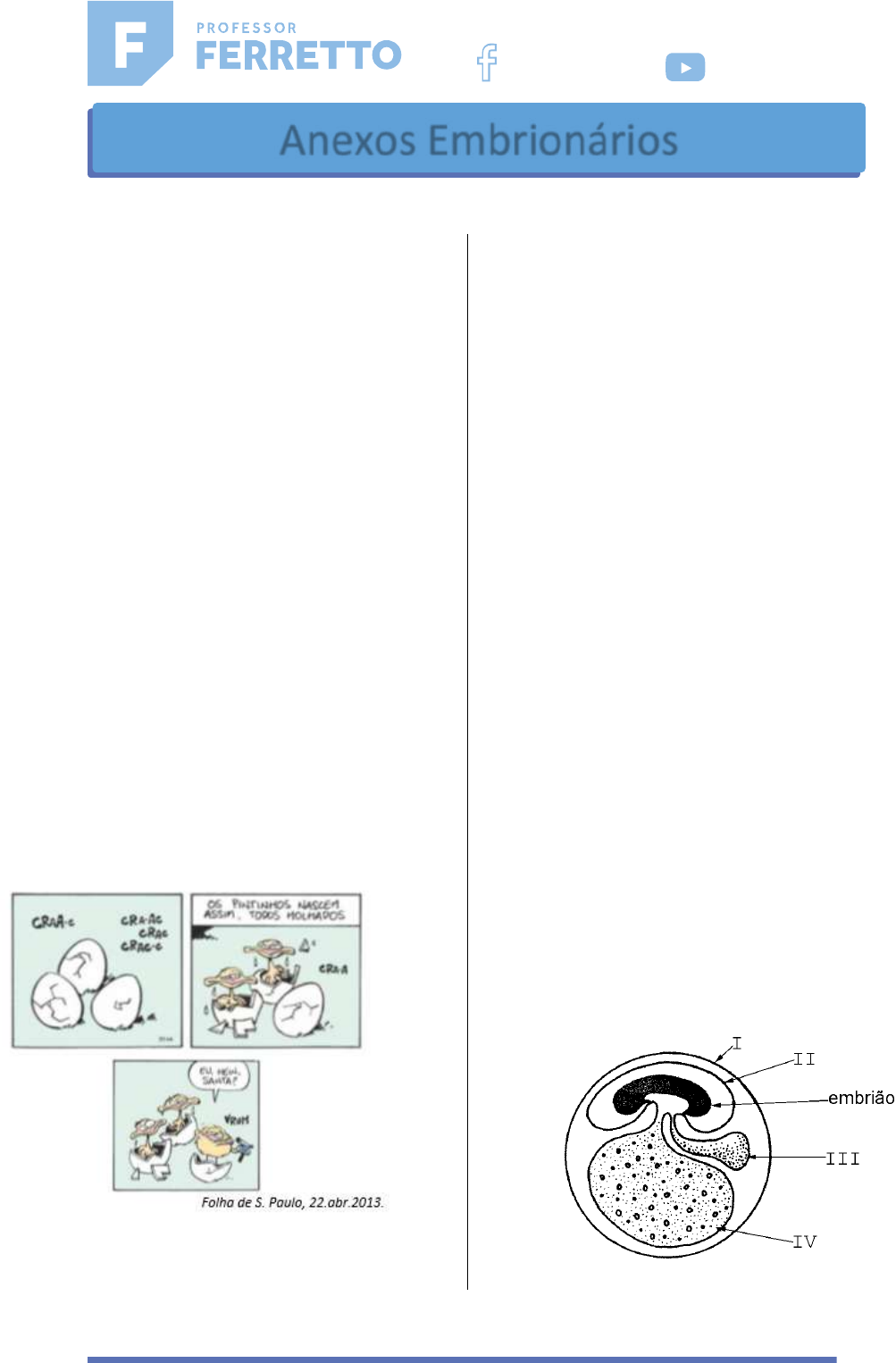 1 01 - (Fcm-jp) Em répteis, aves e mamíferos, paralelamente ao desenvolvimento dos tecidos embrionários, desenvolvem-se membranas celulares extra-embrionárias denominadas anexos embrionários. Estas membranas são: a) Celoma, âmnio, alantoide. b) Âmnio, alantoide, celoma e cório. c) Placenta, vesícula vitelínica, alantoide e cório. d) Saco vitelínico, âmnio, alantoide e cório. e) Alantoide, cório e mórula. 02 - (Uece) O aparecimento do âmnion foi uma apomorfia (característica derivada) que possibilitou aos vertebrados deixarem a água para viverem em terra. Podemos afirmar corretamente que, além de possibilitar o meio líquido para o desenvolvimento embrionário, outra fundamental função do saco amniótico é: a) Armazenar substâncias nutritivas. b) Proteger o feto contra choques mecânicos. c) Nutrir o embrião. d) Acumular excreções embrionárias. 03 - (Pucsp) Analise a tira de quadrinhos: NÍQUEL NÁUSEA Os pintinhos nascem molhados, devido principalmente ao material proveniente a) do âmnio, que armazena excretas nitrogenados do embrião, e do alantoide, que previne dessecação e amortece choques mecânicos. b) do âmnio, que previne dessecação do embrião e amortece choques mecânicos, e do alantoide, que armazena excretas nitrogenados. c) do âmnio, que previne a dessecação do embrião, e do grande número de vilosidades coriônicas ricas em vasos sanguíneos. d) do alantoide, que armazena excretas nitrogenados do embrião, e do grande número de vilosidades coriônicas ricas em vasos sanguíneos. 04 - (Ufpr) Um biólogo mensurou a massa de componentes do ovo de um réptil durante seu desenvolvimento, desde o dia da postura até o momento da eclosão. Ao longo das medidas, o que se espera que tenha ocorrido, respectivamente, com a massa do embrião, do vitelo e do alantoide? a) Aumento – redução – aumento. b) Aumento – aumento – redução. c) Aumento – redução – redução. d) Redução – redução – aumento. e) Redução – aumento – redução. 05 - (Unifor) A figura abaixo mostra uma fase do desenvolvimento embrionário da galinha. As estruturas numeradas encerram cavidades com diferentes funções. www.professorferretto.com.br ProfessorFerretto ProfessorFerretto Anexos Embrionários ee