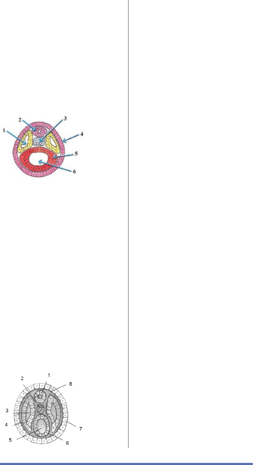 2 a) 1. Ectoderme 2. Placa neural 3. Mesoderme 4. Endoderme 5. Canal neural. b) 1. Placa neural 2. Mesoderme 3. Endoderme 4. Canal neural 5. Ectoderme. c) 1. Placa neural 2. Mesoderme 3. Ectoderme 4. Endoderme 5. Canal neural. d) 1. Ectoderme 2. Mesoderme 3. Placa neural 4. Canal neural 5. Endoderme. e) 1. Placa neural 2. Ectoderme 3. Mesoderme 4. Endoderme 5. Canal neural. 06 - (Fmabc) O esquema representa uma das fases do desenvolvimento embrionário do anfioxo. Essa fase é a a) gástrula, e os folhetos indicados por 4 e 5 são, respectivamente, ectoderme e mesoderme. b) gástrula, e as cavidades indicadas por 1 e 6 são, respectivamente, celoma e arquêntero. c) gástrula, e as estruturas indicadas por 2 e 3 são, respectivamente, tubo neural e notocorda. d) nêurula, e o folheto indicado por 5 e a estrutura indicada por 6 são, respectivamente, mesoderme e arquêntero. e) nêurula, e a cavidade indicada por 1 e a estrutura indicada por 3 são, respectivamente, celoma e notocorda. 07 - (Ufrn) A capacidade de diferenciação de uma célula vai diminuindo à medida que o desenvolvimento do embrião avança. Tendo em vista essa informação, considere o corte transversal de um embrião de mamífero esquematizado ao lado. A opção de resposta cujos números correspondem, respectivamente, às estruturas que darão origem ao tecido cardíaco e às células nervosas é: a) 7 e 2. b) 6 e 8. c) 5 e 3. d) 4 e 1. 08 - (Ufrgs) Assinale a alternativa que preenche corretamente as lacunas do enunciado abaixo, na ordem em que aparecem. A _____ é o processo no qual os folhetos germinativos embrionários são formados. Nos vertebrados, o folheto denominado _____ originará o coração, os vasos e as células sanguíneas. a) clivagem – ectoderma. b) gastrulação – mesoderma. c) neurulação – endoderma. d) clivagem – endoderma. e) gastrulação – ectoderma. 09 - (Unesp) Um pesquisador marcou um grupo de células em um embrião de rato de laboratório. Ao observar o animal adulto, encontrou marcadas as células nervosas. Assinale a alternativa que indica corretamente o tecido embrionário que foi marcado. a) Mesoderma na fase de blástula. b) Endoderma na fase de gástrula. c) Ectoderma na fase de blástula. d) Mesentoderma na fase de blástula. e) Ectoderma na fase de gástrula. 10 - (Ufpr) Para estudar a expressão de determinadas proteínas em anfíbios, pesquisadores associaram um marcador fluorescente aos genes do estudo. Marcadores verdes foram associados a um gene e marcadores vermelhos a outro. Células indiferenciadas foram então transfectadas com um ou outro desses genes e introduzidas em diferentes locais de gástrulas desses anfíbios. Os pesquisadores observaram a fluorescência, mais tarde, nos girinos. Os músculos do animal fluoresceram em verde e a epiderme em vermelho. Para produzir esse resultado, em que regiões da gástrula foram injetados, respectivamente, esses genes? a) Mesoderma e ectoderma. b) Endoderma e ectoderma. c) Ectoderma e endoderma. d) Ectoderma e mesoderma. e) Mesoderma e endoderma.