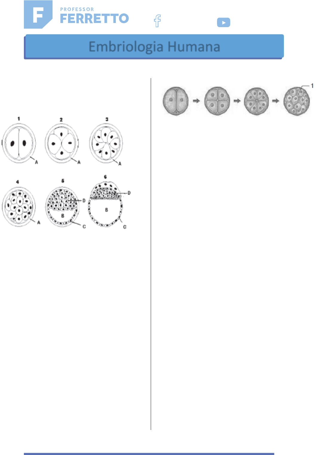 1 01 – (Uesb) A partir da análise do esquema apresentado e com base nos conhecimentos sobre células, marque V para as afirmativas verdadeiras e F, para as falsas. (_) A membrana representada por A potencializa a nidação. (_) Em 1, as células são dotadas de uma mesma carga genética. (_) A fase 6 será implantada no útero e possui células pluripotentes. (_) O desenvolvimento embrionário, observado como um todo, é típico de um ovo telolécito encontrado em aves, por exemplo. A alternativa que contém a sequência correta, de cima para baixo, é a a) FFVV. b) FVVF. c) FVFV. d) VVFF. e) VVVV. 02 – (Fmo) Analisando as etapas do desenvolvimento embrionário humano, mostradas abaixo, é correto afirmar que, logo após o estágio indicado em 1, ocorrerá: a) Ovulação. b) Nidação. c) Fertilização. d) Formação dos anexos embrionários. e) Organogênese. 03 – (Fcm-jp) Considere as seguintes afirmativas sobre o desenvolvimento embrionário humano: I. A fecundação ocorre na tuba uterina; o ovócito II liberado pelo ovário, ao unir-se com o espermatozoide, funde-se a ele, completando a sua segunda divisão meiótica. II. Os anexos embrionários formam-se a partir da placenta, devido a falta da blástula; o âmnio, córion e a vesícula uterina são derivados do trofoblasto. III. A gastrulação ocorre após a implantação do embrião na parede uterina, a organogênese termina no final do segundo mês de gestação. Quais as afirmativas são corretas? a) I, II e III. b) I e III. c) II e III. d) Apenas I. e) Apenas II. 04 – (Fcm-jp) Em 98% dos casos, a gravidez ectópica ocorre na parede da tuba uterina, chamada gravidez tubária. A gravidez ectópica pode causar hemorragias na gestante e gerar complicações graves. Sobre o desenvolvimento embrionário analise as seguintes afirmações: I. Em condições anormais o blastocisto pode se implantar fora do útero. www.professorferretto.com.br ProfessorFerretto ProfessorFerretto Embriologia Humana ee