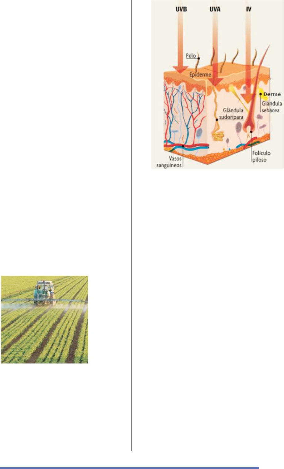 3 10 – (Unichristus) PESTICIDAS SÃO ASSOCIADOS AO CÂNCER DE PELE – NOVAS PESQUISAS SUGEREM QUE O USO REPETITIVO E DE LONGO PRAZO DE PESTICIDAS PODE CAUSAR MELANOMAS De acordo com novo estudo científico, trabalhadores que aplicam certos pesticidas em lavouras estão duas vezes mais propensos de contrair um melanoma, forma de câncer de pele fatal. Os resultados somam a evidência de que sugere que o uso freqüente de defensivos agrícolas pode aumentar o risco de melanoma. As taxas da doença triplicaram nos Estados Unidos nos últimos 30 anos, sendo a exposição ao sol a principal causa identificada. Pesquisadores identificaram seis pesticidas que, com a exposição fre- quente, duplica o risco de câncer de pele entre os fazendeiros e outros trabalhadores que aplicam essas químicas nas plantações. Quatro das químicas – maneb, mancozeb, metil paration e carbaryl – são utilizadas nos Estados Unidos em diversas plantações, incluindo nozes, vegetais e frutas. Já o benomyl e o paration-etil foram voluntariamente cancelados pelos seus fabricantes em 2008. “A maior parte da literatura sobre melanoma foca nos fatores individuais e exposição ao sol. Nossa pesquisa mostra uma associação entre diversos pesticidas e o melanoma, fornecendo evidências para a hipótese de que os pes- ticidas podem ser outra importante fonte de risco de melanoma”, conforme o relatório de epidemiologistas da University of Iowa, do National Institute of Environmental Health Sciences (Instituto Nacional de Ciências da Saúde Ambiental) e do National Cancer Institute (Instituto Nacional do Câncer). Extraído de http://www2.uol.com.br/sciam/noticias/pesticidas_sao_associado s_ao_cancer_de_pele.html, em 04 de outubro de 2010. Além do uso repetitivo e em longo prazo dos pesticidas, o melanoma pode surgir devido à exposição solar excessiva. A figura ao lado mostra um corte da pele humana indicando algumas camadas, anexos e o grau de penetrância das radiações ultravioletas (UV-A e UV-B) e infravermelho. Podemos afirmar, corretamente, que: a) as radiações UV-A penetram profundamente, atingem a hipoderme da pele e são responsáveis pelo fotoenvelhecimento e pelas fotoalergias. b) as radiações UV-B penetram superficialmente, atingem a derme na pele e são causadores de queimaduras solares. c) as radiações infravermelhas penetram profundamente na pele, onde sua energia é absorvida e provoca modificações na derme. d) pelos e glândulas da pele tem origem embriológica mesodérmica. E) na camada basal da epiderme as células são ricas em queratina e possuem baixa capacidade mitótica. 11 – (Ufrn) Devido à maior proximidade da linha do Equador, o Nordeste do Brasil recebe uma elevada incidência de radiação ultravioleta (UV), o que torna a população dessa região mais propensa ao câncer de pele. Essa doença ocorre porque as células do tecido epitelial multiplicam-se com muita frequência, ficando mais vulneráveis à ação dos raios UV existentes na luz solar. Essa maior vulnerabilidade decorre da a) replicação acentuada do DNA, tornando-o mais susceptível às mutações. b) inserção de nucleotídeos no genoma, retardando a duplicação do DNA. c) inversão de bases no DNA, prejudicando a transcrição para RNA. d) substituição de nucleotídeos no RNA, impedindo a formação de radicais livres.