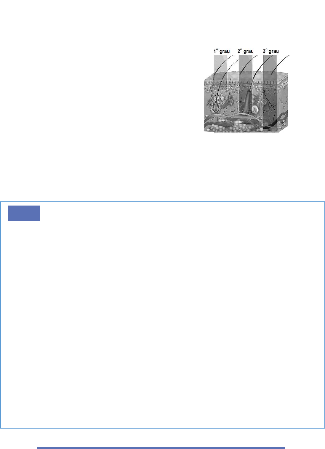 7 a) Colocar óleo na área queimada para neutralizar a sensação térmica e, em seguida, cobrir a lesão com um pano limpo. b) Aplicar bastante gelo no local da queimadura para neutralizar a sensação térmica, passar pomada e cobrir a lesão com gaze. c) Fornecer um analgésico para tranquilizar a vítima, aplicar gelo no local da queimadura e encaminhá-lo para atendimento especializado. d) Colocar a área queimada na água fria para neutralizar a sensação térmica e, em seguida, cobrir a lesão com um pano limpo e levá-lo para um serviço médico imediatamente. e) Colocar pasta de dentes na área queimada para neutralizar a sensação térmica e, em seguida, cobrir a lesão com um pano limpo e levá-lo para um serviço médico imediatamente. 25 – (Fmo) Segundo o Ministério da Saúde, cerca de um milhão de brasileiros sofrem queimaduras ao ano. Analise o fragmento de pele humana, abaixo, ilustrando a extensão dos danos causados por queimaduras. Considerando a figura, é correto afirmar que queimaduras de: a) 1º grau são limitadas à hipoderme. b) 2º grau afetam o extrato córneo da pele. c) 3º grau são limitadas à derme. d) 1º e 2º afetam vasos linfáticos. e) 2º e 3º grau, afetam células adiposas. notas