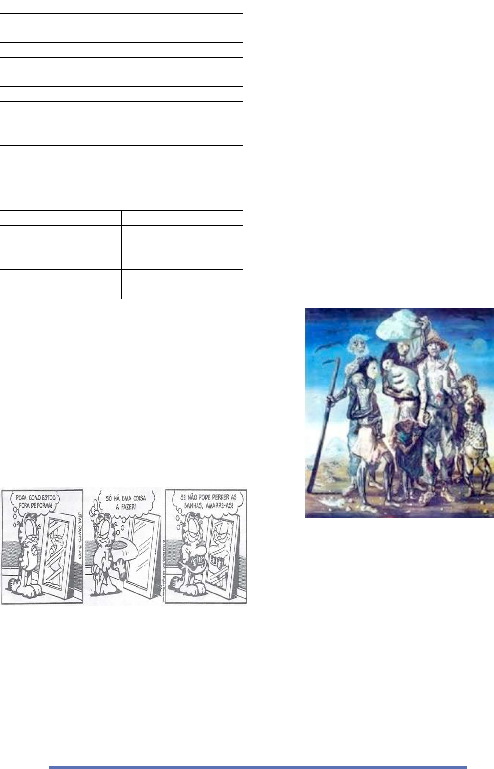 4 IMC CLASSIFICAÇÃO RISCO DE DOENÇA menos de 18,5 magreza elevado entre 18,5 e 24,9 normalidade baixo entre 25 e 29,9 sobrepeso elevado entre 30 e 39,9 obesidade muito elevado 40 ou mais obesidade grave muitíssimo elevado Internet: . Considere as seguintes informações a respeito de João, Maria, Cristina, Antônio e Sérgio. Nome peso (kg) altura (m) IMC João 113,4 1,80 35 Maria 45 1,50 20 Cristina 48,6 1,80 15 Antônio 63 1,50 28 Sérgio 115,2 1,60 45 Os dados das tabelas indicam que a) Cristina está dentro dos padrões de normalidade. b) Maria está magra, mas não corre risco de desenvolver doenças. c) João está obeso e o risco de desenvolver doenças é muito elevado. d) Antônio está com sobrepeso e o risco de desenvolver doenças é muito elevado. e) Sérgio está com sobrepeso, mas não corre risco de desenvolver doenças. 16 – (Enem) DAVIS, J. Garfield está de dieta. Porto Alegre: L&PM, 2006. A condição física apresentada pelo personagem da tirinha é um fator de risco que pode desencadear doenças como a) anemia. b) beribéri. c) diabetes. d) escorbuto. e) fenilcetonúria. 17 – (Fmo) A obesidade é diagnosticada quando o índice de massa corporal (IMC) é superior a 30 Kg/m2. Apesar dos problemas de saúde associados a essa condição, pessoas obesas não são propensas a desenvolverem: a) Anorexia. b) Hipertensão. c) Apneia do sono. d) Diabetes do Tipo 2. e) Infecções de pele. 18 - (Upe) Retirantes (1944) é uma pintura de Cândido Portinari, que retrata corpos muito magros de emigrantes nordestinos fugindo da seca do sertão e de suas sequelas sociais, entre elas, a fome e desnutrição. Em portadores de distúrbios alimentares, outros fatores de ordem social podem levar às mesmas consequências, embora por diferentes causas, dentre elas a distorção da imagem corporal. Na tela, Portinari retrata o que vê e interpreta. No espelho, uma adolescente com distúrbios alimentares, de certo modo, faz o mesmo. Fonte: http://www.universia.com.br/ Sobre os distúrbios alimentares e sua relação com a desnutrição, analise as afirmativas a seguir: I. Na anorexia, o paciente chega a ficar severamente desidratado, ocorrendo a perda de íons, como o sódio, o potássio e o cálcio, importantes para a manutenção do equilíbrio hídrico e iônico e o funcionamento das células musculares, por exemplo. II. Na bulimia, pacientes exibem compulsão alimentar e comportamentos compensatórios à alta ingestão de alimentos, como vômitos, uso indevido de laxantes, diuréticos, polivitamínicos e anabolizantes. III. Na anorexia e na bulimia, os pacientes praticam jejum e exercícios intensos, além de provocarem vômito.