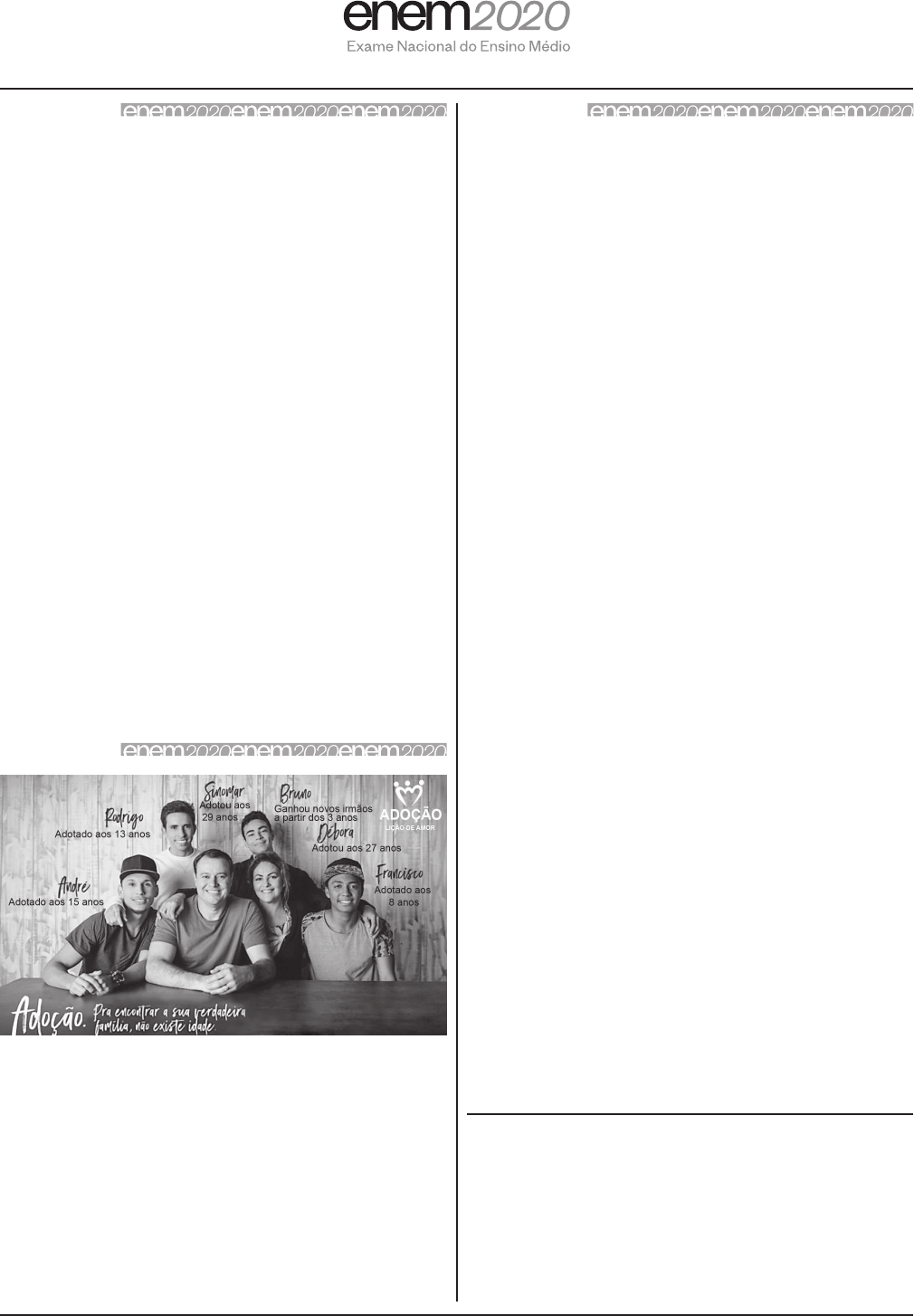 Questão 43 Quando quis agilizar o processo de seleção de novos alunos, a tradicional faculdade britânica de medicina St. George usou um software para definir quem deveria ser entrevistado. Ao reproduzir a forma como os funcionários faziam essa escolha, o programa eliminou, de cara, 60 de 2 000 candidatos. Só por causa do sexo ou da origem racial, numa dedução baseada em sobrenome e local de nascimento. Um estudo sobre o caso foi publicado em 1988, mas, 25 anos depois, outra pesquisa apontou que esse tipo de discriminação segue firme. O exemplo recente envolve o buscador do Google: ao digitar nomes comuns entre negros dos EUA, a chance de os anúncios automáticos oferecerem checagem de antecedentes criminais pode aumentar 25%. E pode piorar com a pergunta “detido?” logo após a palavra procurada. Disponível em: https://tab.uol.com.br. Acesso em: 11 ago. 2017 (adaptado). O texto permite o desnudamento da sociedade ao relacionar as tecnologias de informação e comunicação com o(a) A agilidade dos softwares. B passar dos anos. C linguagem. D preconceito. E educação. Questão 44 Disponível em: www.acontecendoaqui.com.br. Acesso em: 15 jun. 2018. Nessa campanha publicitária, a imagem da família e o texto verbal unem-se para reforçar a ideia de que A a família que adota é mais feliz. B a adoção tardia é muito positiva. C as famílias preferem adotar bebês. D a adoção de adolescentes é mais simples. E os filhos adotivos são companheiros dos pais. Questão 45 Viajo Curitiba das conferências positivistas, elas são onze em Curitiba, há treze no mundo inteiro; do tocador de realejo que não roda a manivela desde que o macaquinho morreu; dos bravos soldados do fogo que passam chispando no carro vermelho atrás do incêndio que ninguém não viu, esta Curitiba e a do cachorro-quente com chope duplo no Buraco do Tatu eu viajo. Curitiba, aquela do Burro Brabo, um cidadão misterioso morreu nos braços da Rosicler, quem foi? quem não foi? foi o reizinho do Sião; da Ponte Preta da estação, a única ponte da cidade, sem rio por baixo, esta Curitiba viajo. Curitiba sem pinheiro ou céu azul, pelo que vosmecê é — província, cárcere, lar —, esta Curitiba, e não a outra para inglês ver, com amor eu viajo, viajo, viajo. TREVISAN, D. Em busca de Curitiba perdida. Rio de Janeiro: Record, 1992. A tematização de Curitiba é frequente na obra de Dalton Trevisan. No fragmento, a relação do narrador com o espaço urbano é caracterizada por um olhar A destituído de afetividade, que ironiza os costumes e as tradições da sociedade curitibana. B marcado pela negatividade, que busca desconstruir perspectivas habituais de representação da cidade. C carregado de melancolia, que constata a falta de identidade cultural diante dos impactos da urbanização. D embevecido pela simplicidade do cenário, indiferente à descrição de elementos de reconhecido valor histórico. E distanciado dos elementos narrados, que recorre ao ponto de vista do viajante como expressão de estranhamento. *010175AZ18* LC - 1° dia | Caderno 1 - AZUL - Página 18