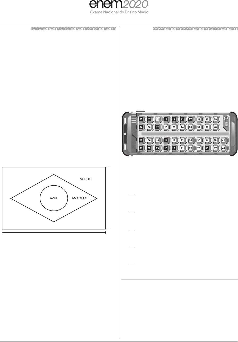 Questão 179 A fabricação da Bandeira Nacional deve obedecer ao descrito na Lei n. 5.700, de 1º de setembro de 1971, que trata dos Símbolos Nacionais. No artigo que se refere às dimensões da Bandeira, observa-se: “Para cálculos das dimensões, será tomada por base a largura, dividindo-a em 14 (quatorze) partes iguais, sendo que cada uma das partes será considerada uma medida ou módulo (M). Os demais requisitos dimensionais seguem o critério abaixo: I. Comprimento será de vinte módulos (20 M); II. A distância dos vértices do losango amarelo ao quadro externo será de um módulo e sete décimos (1,7 M); III. O raio do círculo azul no meio do losango amarelo será de três módulos e meio (3,5 M).” BRASIL. Lei n. 5.700, de 1º de setembro de 1971.Disponível em: www.planalto.gov.br. Acesso em: 15 set. 2015. A figura indica as cores da bandeira do Brasil e localiza o quadro externo a que se refere a Lei n. 5.700. Comprimento do quadro externo La rg ur a do q ua dr o ex te rn o Um torcedor, preparando-se para a Copa do Mundo e dispondo de cortes de tecidos verde (180 cm x 150 cm) e amarelo (o quanto baste), deseja confeccionar a maior Bandeira Nacional possível a partir das medidas do tecido verde. Qual a medida, em centímetro, do lado do menor quadrado de tecido azul que deverá ser comprado para confecção do círculo da bandeira desejada? A 27 B 32 C 53 D 63 E 90 Questão 180 Uma empresa de ônibus utiliza um sistema de vendas de passagens que fornece a imagem de todos os assentos do ônibus, diferenciando os assentos já vendidos, por uma cor mais escura, dos assentos ainda disponíveis. A empresa monitora, permanentemente, o número de assentos já vendidos e compara-o com o número total de assentos do ônibus para avaliar a necessidade de alocação de veículos extras. Na imagem tem-se a informação dos assentos já vendidos e dos ainda disponíveis em um determinado instante. A razão entre o número de assentos já vendidos e o total de assentos desse ônibus, no instante considerado na imagem, é A 16 42 B 16 26 C 26 42 D 42 26 E 42 16 *020825RO31* MT - 2° dia | Caderno 8 - ROSA - Página 31