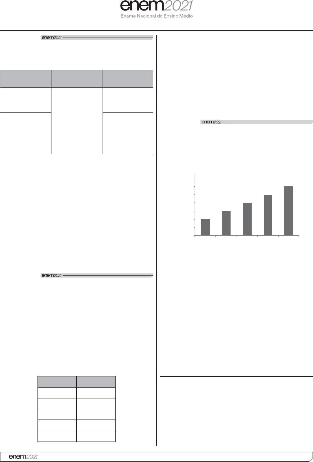 17MT - 2° dia | Caderno 7 - AZUL - 2ª Aplicação *020325AZ17* Questão 144 Para um evento que acontecerá no centro de uma ����� $�+?����%'���� � �> � ������� � � $��� ���!���� da seguinte maneira: Estacionamento X Estacionamento Y Estacionamento Z �·��$���% 2���¢� hora ou P��'���� �+��� R$ 3,70 por hora ou P��'���� �+��� �·�&$���% 2���¢� hora ou P��'���� �+��� R$ 2,50 por cada hora subsequente ou P��'���� �+��� R$ 2,00 por cada hora subsequente ou P��'���� �+��� ��� �% �� ��� �%�� ���%�������� # � ��%� �� ��� estacionar seus carros, uma delas pelo período de 1 hora e 50 minutos e a outra pelo período de 4 horas, pretendendo cada uma pagar o menor preço total pelo uso do estacionamento. � � � % �� � � # ���� �% ��$� � % � �#�� � $� % 2� � estacionamentos A � ±� �¡( B Y e Y. C � º� �¡( D � ¡� �±( E � ¡� �¡( Questão 145 Um casal decidiu aplicar em um fundo de investimentos que tem uma taxa de rendimento de 0,8% ao mês, num � J�� �� ���%� �2���'������%� �(� ��#�2������2�F a ser resgatado, depois de n meses, a uma taxa de rendimento mensal x$�̂ ������% 2�� @%� ��� algébrica F � C (1 x)n, em que C representa o capital inicial aplicado. �� �� �2� %2�� "�� ��� �� �� �%2���'��� % 2�� �%�� necessário para que o capital inicial de R$ 100 000,00 duplique, sem outros depósitos ou retiradas. Fazendo uso da tabela, o casal pode determinar esse número de meses. Y Log Y 1,008 0,003 1,08 0,03 1,8 0,20 2 0,30 3 0,47 Para atender ao seu planejamento, o número de meses determinado pelo casal é A 156. B 125. C 100. D 10. E 1,5. Questão 146 Uma confeiteira pretende divulgar em um sítio da internet os doces que produz, mas só fará isso se acreditar que o número de acessos por semana ���% � ��?� ��J� ����������#�2J�'��(������ �$�% ���� que lhe enviassem dados sobre o número de acessos ao G ����� �K2 ��� �&� ���� � �� � ! ����J�?������ J���( 162 1ª 2ª 3ª 4ª 5ª 160 160 158 158 156 156 154 154 152 152 150 148 Ac es so Semana A confeiteira acredita que, se o número de acessos mantiver o mesmo crescimento semanal para as próximas &� ���� $�������2�� �% �G����#�2 �?���% �����# ��� �����#�2J�'��( O número de acessos que a confeiteira acredita ser ���� � �%������ �����#�2J�'������ G ���#�2+����% ���^ A 162. B 170. C 172. D 312. E 320. Azul CN MT 2 Dia P2.indb 17 10/09/2021 10:11:16