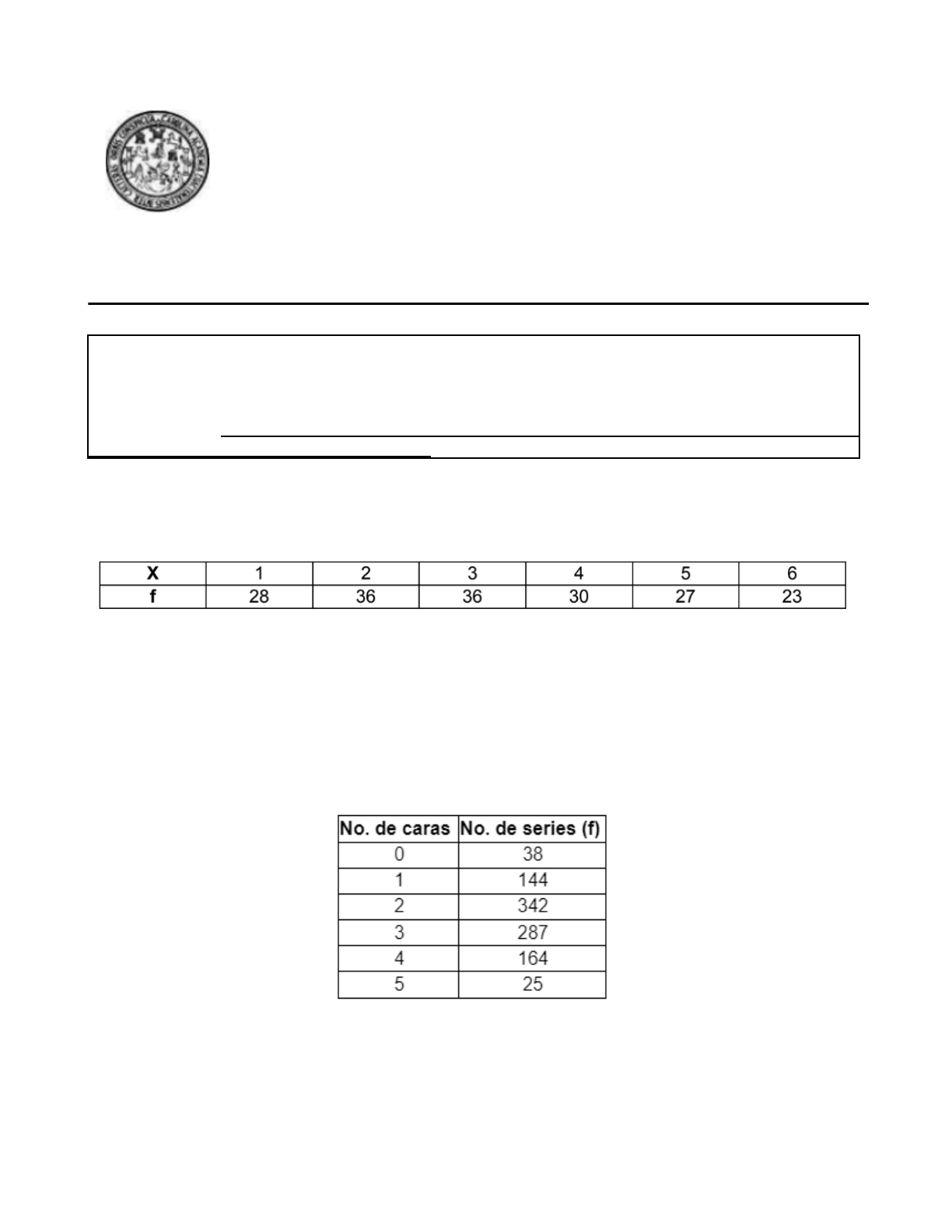 UNIVERSIDAD DE SAN CARLOS DE GUATEMALA FACULTAD DE INGENIERÍA ÁREA DE ESTADÍSTICA ESTADÍSTICA 2 SECCIÓN R TAREA PREPARATORIA TERCER PARCIAL PRIMER SEMESTRE 2025 INSTRUCCIONES: resuelva los siguientes problemas dejando constancia de sus procedimientos los cuales deberá subir en el apartado correspondiente en su sección de la práctica en UEDI. El archivo debe tener formato PDF o Excel con el nombre: CARNÉ_TP3_SECCIÓN. (máximo 2 archivos). Después de resolver la tarea debe ingresar a su sección de práctica y responder el cuestionario correspondiente. El cuestionario estará disponible desde el 22 de abril a las 8:00 horas al 25 de abril a las 23:59 horas. No habrá prórroga. Problema 1 Un dado se lanza 180 veces con los siguientes resultados: ¿Se trata de un dado no cargado? Utilice un nivel de significancia de 0.01. Problema 2 Una moneda fue lanzada al aire 1000 series, de 5 veces cada serie y se observó el número de caras de cada serie. El número de series en las que se presentaron 0, 1, 2, 3, 4 y 5 caras se muestra en la siguiente tabla. Verifique si los datos se ajustan a una distribución binomial. Utilice un nivel de significancia de 0.05 (p=0.494) Problema 3 A continuación, se presenta el número de ocurrencias por lapso de tiempo y su frecuencia observada. Use α = 0.05 y la prueba de bondad de ajuste para ver si estos datos se ajustan a una distribución de Poisson. Número de ocurrencias Frecuencia observada 0 30 1 30 2 30 3 18 4 3 Problema 4 En la siguiente tabla se presentan las observaciones de color de ojos y cabello de 300 estudiantes. Use un nivel de significancia de 0.01 para probar la independencia de los dos atributos. Problema 5 Se ha realizado una prueba de rapidez a alumnos procedentes de dos grupos distintos, cuyos resultados se presentan en la siguiente tabla. notas (grupo A) notas (grupo B) 40 34 39 36 29 42 32 38 36 37 27 41 Si se trata de muestras aleatorias simples procedentes de poblaciones normalmente distribuidas. ¿Existe evidencia de la igualdad de varianzas de las puntuaciones de los dos grupos? Utilice alfa = 0.10. Problema 6 Los siguientes valores corresponden al diámetro transverso máximo de cráneos de hombres egipcios de distintas épocas. Si los cambios en la forma de la cabeza a lo largo del tiempo sugieren mestizaje, suponiendo distribución normal en las poblaciones, ¿Es posible comprobar que hubo mestizaje en estas poblaciones? Realice un ANOVA para determinar si existe diferencia en las medidas del diámetro transverso máximo. Aplique la prueba de Tukey de ser necesario. Nivel de significancia: 0.05. Problema 7 Un agricultor desea comparar la efectividad de tres fertilizantes diferentes (A, B y C) en el crecimiento de una determinada planta. Sabe que el tipo de suelo tiene un gran impacto en el crecimiento de las plantas, para controlar este factor, decide utilizar un diseño por bloques. Los resultados se muestran en la siguiente tabla. Utilice un nivel de significancia de 0.05. Problema 8 La tabla refleja las puntuaciones obtenidas por catorce operarios adiestrados en una determinada técnica, aplicando tres métodos alternativos. Realice un ANOVA para determinar si son significativamente diferentes los resultados obtenidos con los tres métodos.