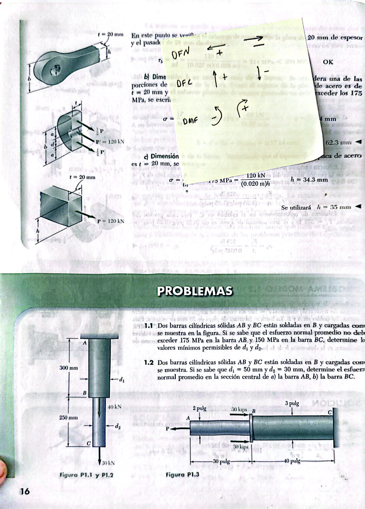 = 20 mm En este punto se 20 mm de espesor y el pasado OFN t h + 120 Tb OK - b b) Dime + dera una de las porciones de DFC de acero es de 20 mm y exceder los 175 MPa, se DMF mm a d = 120 kN 62.3 mm a c) Dimensión de acero es = 20 mm, se t = 20 mm 120 kN MPa = h = tn (0.020 m)h . Se utilizará h = 35 mm P = 120 kN PROBLEMAS 1.1 Dos barras cilíndricas sólidas AB y BC están soldadas en B y cargadas come se muestra en la figura. Si se sabe que el esfuerzo normal promedio no debe A exceder 175 MPa en la barra AB y 150 MPa en la barra BC, determine valores mínimos permisibles de d1 y d2. 1.2 Dos barras cilíndricas sólidas AB y BC están soldadas en B y cargadas com se muestra. Si se sabe que = 50 mm y d2 = 30 mm, determine el esfuerz d1 normal promedio en la sección central de a) la barra AB, b) la barra BC. B 40 kN 3 pulg 2 pulg 30 kips B C 250 mm A d2 P C 30 kips 30 kN 30 pulg 40 pulg Figura P1.1 y P1.2 Figura P1.3 161.3 Dos barras cilíndricas sólidas AB y BC se encuentran soldadas en B y carga- Problemas 17 das como se muestra. Determine la magnitud de la fuerza P para la que el esfuerzo de tensión en la barra AB tiene la misma magnitud que el esfuerzo de compresión en la barra BC 1.4 En el problema 1.3, si se sabe que P = 40 kips, determine el esfuerzo normal promedio en la sección media de a) la barra AB, b) la barra BC. 1.5 Dos placas de acero deben sujetarse por medio de pasadores de acero de alta resistencia de 16 mm de diámetro que embonan con suavidad dentro de Figura P1.5 espaciadores cilíndricos de latón. Si se sabe que el esfuerzo normal promedio no debe exceder 200 MPa en los pasadores y 130 MPa en los espaciadores, determine el diámetro exterior de los espaciadores que ofrece el diseño más A económico y seguro. 1.6 Dos barras de latón AB y BC, cada una con diámetro uniforme, se soldarán 15 mm entre sí en B para formar una barra no uniforme con longitud total de 100 m B que se suspenderá de un soporte en A, como se muestra en la figura. Si se sabe que la densidad del latón es de 8 470 determine a) la longitud de 100 m la barra AB para la cual el esfuerzo normal máximo en ABC es mínimo, b) el valor correspondiente del esfuerzo normal máximo. 10 mm 1.7 Cada uno de los cuatro eslabones verticales tiene una sección transversal rec- tangular uniforme de 8 X 36 mm y cada uno de los cuatro pasadores tiene un diámetro de 16 mm. Determine el valor máximo del esfuerzo normal promedio C en los eslabones que conectan a) los puntos B y D, b) los puntos C y E. Figura P1.6 1.8 Si se sabe que el eslabón DE tiene pulg de espesor y 1 pulg de ancho, deter- mine el esfuerzo normal en la porción central de dicho eslabón cuando a) = 0, b) 0 = 90°. 0.4 m C 1.9 El eslabón AC tiene una sección transversal rectangular uniforme de 16 pulg de 0.25 m espesor y pulg de ancho. Determine el esfuerzo normal en la porción central 0.2 de dicho eslabón. B 4 pulg 4 pulg 12 pulg 20 kN E E 2 pulg A C D 8 pulg F Figura P1.7 60 lb 0 Figura P1.8 1.10 Se aplican tres fuerzas, cada una con magnitud P = 4 kN, sobre el mecanismo mostrado. Determine el área de la sección transversal de la porción uniforme de la barra BE si el esfuerzo normal en dicha porción es de +100 MPa. 0.100 m 240 lb 3 pulg 6 pulg 7 pulg B C 240 lb 0.150 m 0.300 m 0.250 m Figura P1.9 Figura P1.10