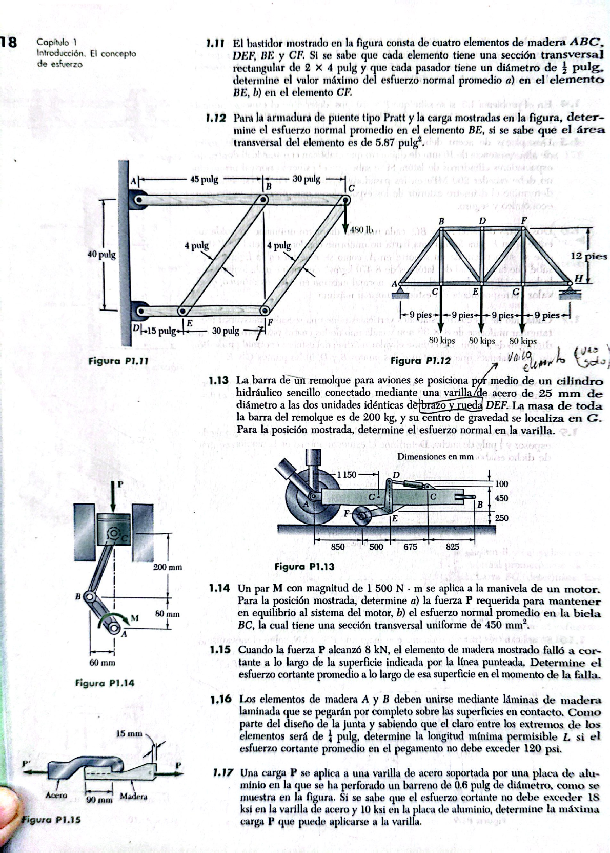 18 Capítulo 1 1.11 El bastidor mostrado en la figura consta de cuatro elementos de madera ABC, El concepto DEF, BE y CF. Si se sabe que cada elemento tiene una sección transversal de rectangular de 2 4 pulg y que cada pasador tiene un diámetro de determine el valor máximo del esfuerzo normal promedio a) en el elemento BE, b) en el elemento CF. 1.12 Para la armadura de puente tipo Pratt y la carga mostradas en la figura, deter- mine el esfuerzo normal promedio en el elemento BE, si se sabe que el área transversal del elemento es de 5.87 A 45 pulg 30 pulg B C B D F 480 lb 4 pulg 4 pulg 40 pulg 12 pies H A C E G 9 pies 9 pies 9 pies 9 pies E F 30 pulg 80 kips 80 kips 80 kips Figura P1.11 Figura P1.12 1.13 La barra de un remolque para aviones se posiciona por medio de un cilindro hidráulico sencillo conectado mediante una varilla de acero de 25 mm de diámetro a las dos unidades idénticas y rueda DEF. La masa de toda la barra del remolque es de 200 kg, y su centro de gravedad se localiza en G. Para la posición mostrada, determine el esfuerzo normal en la varilla. Dimensiones en mm 1150 D P 100 G C 450 B E 250 850 500 675 825 200 mm Figura P1.13 1.14 Un par M con magnitud de N . m se aplica a la manivela de un motor. B Para la posición mostrada, determine a) la fuerza P requerida para mantener 80 mm M en equilibrio al sistema del motor, b) el esfuerzo normal promedio en la biela BC, la cual tiene una sección transversal uniforme de 450 A 1.15 Cuando la fuerza P alcanzó 8 kN, el elemento de madera mostrado falló a cor- 60 mm tante a lo largo de la superficie indicada por la línea punteada, Determine el esfuerzo cortante promedio a lo largo de esa superficie en el momento de la falla. Figura P1.14 1.16 Los elementos de madera A y B deben unirse mediante láminas de madera laminada que se pegarán por completo sobre las superficies en Como parte del diseño de la junta y sabiendo que el claro entre los extremos de los 15 mm elementos será de 1 pulg, determine la longitud mínima permisible L si el esfuerzo cortante promedio en el pegamento no debe exceder 120 psi. P 1.17 Una carga P se aplica a una varilla de acero soportada por una placa de alu- minio en la que se ha perforado un barreno de 0.6 pulg de diámetro, como se Acero 90 mm Madera muestra en la figura. Si se sabe que el esfuerzo cortante no debe exceder 18 ksi en la varilla de acero y 10 ksi en la placa de aluminio, determine la máxima Figura P1.15 carga P que puede aplicarse a la varilla.1.18 Dos planchas de madera, cada una de 22 mm de grosor y 160 mm de ancho, Problemas 19 están unidas por el ensamble pegado de mortaja que se muestra en la figura. Si se sabe que la junta fallará cuando el esfuerzo cortante promedio en el pegamento alcance los 820 kPa, determine la longitud mínima permisible d de los cortes si la junta debe soportar una carga axial de P = 7.6 5.8 kips 1.19 La carga P aplicada sobre una varilla de acero se distribuye hacia una viga de soporte mediante una arandela anular. El diámetro de la varilla es de 22 mm y el diámetro interior de la arandela es de 25 mm, el cual es un poco mayor que el del orificio. Determine el mínimo diámetro exterior d permisible para la arandela, si se sabe que el esfuerzo normal axial en la varilla de acero es de 35 MPa y que el esfuerzo de aplastamiento promedio entre la arandela pulg y la viga no debe exceder 5 MPa. 1.20 La fuerza axial en la columna que soporta la viga de madera que se muestra en la figura es P = 20 kips. Determine la longitud mínima permisible L de 4 pulg B la zapata de carga si el esfuerzo de aplastamiento en la madera no debe ser mayor que 400 psi. 5.8 kips 1.21 Una carga axial P es soportada por una columna corta W8 40 con un área de sección transversal A = 11.7 y se distribuye hacia un cimiento de Figura P1.16 concreto mediante una placa cuadrada como se observa en la figura. Si se sabe que el esfuerzo normal promedio en la columna no debe exceder 30 ksi y que el esfuerzo de aplastamiento sobre el cimiento de concreto no debe exceder 3.0 ksi, 1.6 pulg determine el lado a de la placa que proporcionará el diseno más económico y seguro. 0.4 pulg 0.25 pulg 0.6 pulg Pegamento 20 mm P' P 160 mm 22 mm P 20 mm Figura P1.17 P Figura P1.18 Figura P1.19 1.22 Una carga axial de 40 kN se aplica sobre un poste corto de madera, el cual L está sostenido por un basamento de concreto que descansa sobre suelo regular. Determine a) el esfuerzo de aplastamiento máximo sobre el basamento de con- creto, b) el tamaño del basamento para el cual el esfuerzo de apoyo promedio en el suelo es de 145 kPa. 1.23 Una varilla de acero AB con pulg de diámetro se ajusta a un orificio redondo 6 pulg cerca del extremo C del elemento de madera CD. Para la carga mostrada, determine a) el esfuerzo máximo normal promedio en la madera, b) la distancia b para la cual el esfuerzo cortante promedio es de 100 psi sobre las superficies P indicadas por líneas punteadas, c) el esfuerzo de aplastamiento promedio sobre Figura P1.20 la madera. P 1 pulg lb P a 750 lb 120 mm 100 mm A 4 pulg D 750 lb B C b b Figura P1.21 Figura P1.22 Figura P1.23