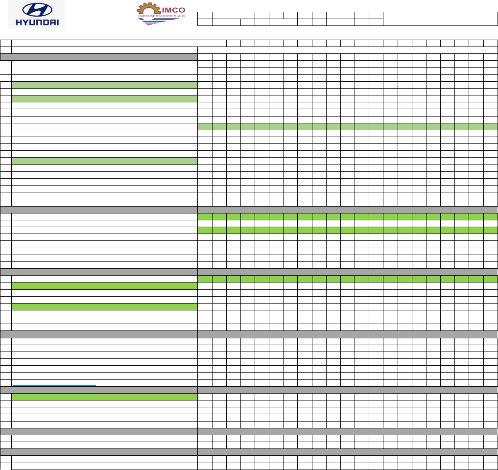 PLANTILLA DE MANTENIMIENTO PREVENTIVO COUNTY HYUNDAI LEYENDA: I Inspeccionar IA L Lubricar N° C Limpiar R Reemplazar T Ajustar La siguiente plantilla de mantenimiento preventivo conserva los parametros del representante de la marca Conc R: Sustituir, I: Inspeccionar y después, si es preciso, limpiar, ajustar, reparar o sustituir; A: Ajustar 10 5 10 15 20 25 30 35 40 45 50 55 60 65 70 75 80 85 90 95 100 I I I I I C 2 Sistema de Refrigeracion 3 Aceite del motor & Filtro de aceite del motor (D4DA, D4DB, D4DC, D4DBD, D4DD) C C C C C C C C C C C C C C C C C C C C C 4 Filtro de combustible (D4AF, D4AL, D4DA, D4DB, D4DC, D4DBD) R R R R R R 5 Cañerías y conexiones combustible I I 6 Retirada de materias extrañas del depósito de combustible I I I I I I I I I I 7 Vaciado de separador de agua I I I I I I I I I I I I I I I I I I I I I 8 Cambio del aceite del intercooler C C 9 Elemento de filtro de aire C C C C C C C C C C C C C C C C C C C C C 10 Holgura de válvula A A A A A A 11 Gases de escape I I I I I I I I I I 12 Presión de inyección y estado de los inyectores I I I I I 13 Puesta a punto de encendido I I I I I 14 Tapadera del radiador I I I 15 Correas de la culata I I 16 Estado del funcionamiento del motor I I 17 Tensión y estado de la correa de la Transmisión (V) I I I I I I I R I I I I I I I R I I I I 18 Correa con nervios en V (D4GA) 19 Sensor de flujo de masa de aire (MAF) (D4GA) 20 Termostato I I I I I I I I I I I I I I I I I I I I I " " " " " " " " " " " " " " " " " " " " " 21 Liquido para la Transmisión C 22 Juego y funcionamiento del pedal del embrague y del freno I I I I I I I I I I 23 Liquido de embrague C C 24 Holgura de la palanca de cambio I I I I I I I I I I 25 Estado de la unión del árbol de transmisión T T T T 26 Junta universal del eje propulsor y acanaladura I I I I I I I I I I 27 Acoplamiento del eje del cojinete central propulsor I I I I I I I I I I 28 Apriete del cojinete central del propulsor I I I I " " " " " " " " " " " " " " " " " " " " " 29 Aceite para el eje trasero C C 30 Estado de los ejes delantero y trasero I I 31 Holgura y daños del cojinete del cubo de las ruedas delanteras y traseras I I I I I I 32 Engrase del cojinete del cubo de las ruedas delanteras y traseras R R I R 33 Tuercas y pernos de las ruedas T T T T T T T T T T T T T T T T T T T T T 34 Par de apriete de las tuercas de las ruedas T T T T T T T T T T T T T T T T T T T T T 35 Presión y estado de los neumáticos I I I I I I I I I I I I I I I I I I I I I 36 Rotación de los neumáticos C C C C C C " " " " " " " " " " " " " " " " " " " " " 37 Líquido hidráulico del mecanismo de la dirección asistida R R R 38 Fugas de líquido del sistema de dirección I I I I I I I I I I I I I I I I I I I I 39 Holgura y varillaje de dirección (con el motor en marcha) I I I I I I I I I I I I I I I I I I I I 40 Guardapolvos/Rótula del remolque I I I I I I I I I I 41 Alineación del eje (deslizamiento lateral) I I 42 Funcionamiento de la dirección I I I I I I I I I I I I I I I I I I I 43 Bomba y correa de la dirección asistida I I I I I I I I I I I I I I I I I I I I I " " " " " " " " " " " " " " " " " " " " " 44 Liquido de embrague/frenos R R R R R R R R R R 45 Fuga de líquido en el circuito de freno I I I I I I I I I I 46 Tambor y zapatas de los frenos / pastilla del freno y rotor de discos I I I I I I I I I I I I I I I I I I I I I 47 Juego del pedal del freno I I I I I I I I I I 48 Distancia entre la posición del pedal pisado a fondo y suelto I I I I I I I I I I " " " " " " " " " " " " " " " " " " " " " 49 Funcionamiento del freno de estacionamiento I I I I I I I I I I I I I I I I I I I I I 50 Desgaste de tambor y zapata I I I I I I I I I I " " " " " " " " " " " " " " " " " " " " " 51 Testigos I I I I I I I I I I I I I I I I I I I I I 52 Faros I I I I I I I I I I I I I I I I I I I I I X 1000 ACTIVIDAD PROGRAMADA FRENO DE MANO ELECTRICO SISTEMA 1 Líquido refrigerante del motor GRUPO MOTOR TRACCION DIRECCION FRENOS