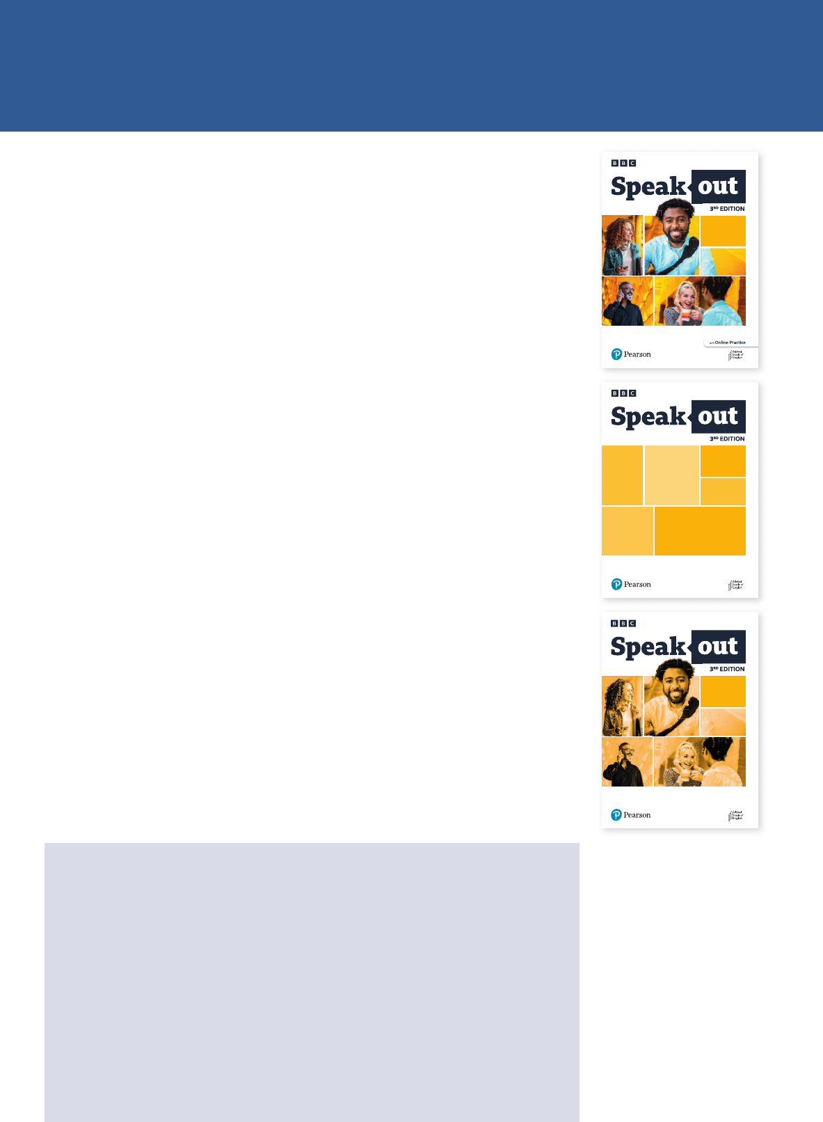 8 Welcome to the new edition of our best-selling, eight-level general English course for adults, designed for in-class, online and hybrid use. Developed in partnership with BBC Studios, Speakout 3rd Edition is the go-to course for teachers looking for comprehensive four-skills coverage, with a particular emphasis on developing learners’ confi dence in speaking. Speakout 3rd Edition is the result of extensive research with users of Speakout 2nd Edition from around the world. It builds on the tried-and-tested methodology of the series, but has been brought up to date with 100% new content, a revised syllabus based on the Global Scale of English and a fresh new look and feel. With a clearer layout and lesson fl ow, and an enhanced digital environment off ering even more fl exibility, the new edition Presentation Tool and Student’s eBook can be used on any device – computer, tablet and mobile phone – and all activities from the eBook and the Online Practice report to the gradebook. We have kept the features that teachers say they love, including global topics, authentic BBC video and audio, international accents and motivating discussion questions, and we have added some exciting new features, such as Future Skills focus boxes, standalone Mediation lessons, an enhanced pronunciation syllabus, and interactive speaking practice activities which provide students with out-of-class, on-the-go speaking practice. Speakout 3rd Edition features all-new BBC programme clips, street interviews, and vlogs fi lmed by people from around the world, all of which bring authenticity to the course and encourage students to be more motivated and confi dent in learning English. The Global Scale of English is embedded in the course, making it clear for learners and teachers why they are doing every task as well as providing a tangible framework for assessment and measurement of progress. ‘How to …’ lessons and Future Skills boxes bring real-world strategies into the course, meaning that employability and personal growth are embedded within the lesson content. There are also independent Mediation lessons at the back of every Student’s Book from A2 to C1–C2 to further develop learners’ soft and employability skills. The course is also mapped to the Adult Benchmark Tests, which provide clear, at-a-glance reporting, helping learners become more purposeful about their learning, and to Pearson English International Certifi cate, which is for learners wishing to take a test that gives them a profi ciency certifi cate (see page 24 for details). We are also delighted to introduce our interactive ‘Speak Anywhere’ speaking practice activities. These digital speaking roleplays are an extension of the ‘How to …’ lessons and are designed to give learners freer practice using the target language of the lesson, and also to give them some general fl uency practice on the lesson topic. Students can do these activities on their own, outside the classroom, on a computer, tablet or mobile phone, and receive feedback on their performance within the activity. Welcome to the third edition of our best-selling eight-level general English course for adults – Speakout. Developed in association with BBC Studios, this new edition has been completely revised based on feedback from Speakout users from all over the world. Speakout 3rd Edition offers 100% new content, all-new video, and a fresh new look and feel, all underpinned by flexible components for in-class, online and hybrid use. • Built on the Global Scale of English, providing clear objectives for every stage of a lesson • All-new BBC video, including clips from popular TV programmes, street interviews, and vlogs for maximum exposure to authentic English as it is spoken around the world • Innovative speech recognition for out-of-class speaking practice • Enhanced pronunciation strand with recording feature • Integrated skills for employability, including mediation lessons and ‘future skills’ training to help learners prepare for the changing world of work • Mapped to external exams, including the Benchmark Test and Pearson English International Certifi cate Learning English with Pearson? Access English language materials to support your learning journey. Ready to prove your English skills? Get exclusive preparation materials for Pearson English exams. pearsonenglish.com/exams-off er Student’s Book and eBook with Online Practice • The eBook brings the Student’s Book to life with interactive activities with instant marking, video and audio • Online Practice provides Workbook activities with instant marking Also available • Student’s eBook with Online Practice Access Code • Workbook • Split editions pearsonenglish.com/speakout3e Speakout 3rd Edition is fully accessible on your computer, tablet and mobile phone so that you can enjoy the full functionality of your course wherever you are. Frances Eales | Steve Oakes Student’s Book and eBook A 2+ Student’s B ook and eB ook Frances E ales | Steve O akes A2+ Speakout 3rd Edition GSE Benchmark Pearson English International Certifi cate A1 22-32 Benchmark Test A A1 A2 30-38 Benchmark Test A Level 1 (A2) A2+ 36-44 Benchmark Test A Level 1 (A2) B1 42-52 Benchmark Test B1 Level 2 (B1) B1+ 50-60 Benchmark Test B1 Level 2 (B1) B2 58-67 Benchmark Test B2 Level 3 (B2) B2+ 64-76 Benchmark Test B2 Level 3 (B2) C1–C2 73-90 Benchmark Test C Level 4 (C1) & Level 5 (C2) Speakout_3E_A2P_SBK_CVR.indd All PagesSpeakout_3E_A2P_SBK_CVR.indd All Pages 15/11/2022 10:54 am15/11/2022 10:54 am Lindsay Warwick Teacher’s Book with Teacher’s Portal Access Code Also available • Student’s Book and eBook with Online Practice • Student’s eBook with Online Practice Access Code • Workbook • Split editions • Teacher’s Portal Access Code Teacher’s Book with Teacher’s Portal Access Code • Presentation Tool with a digital version of the Student’s Book and Workbook, lesson notes, audio, 