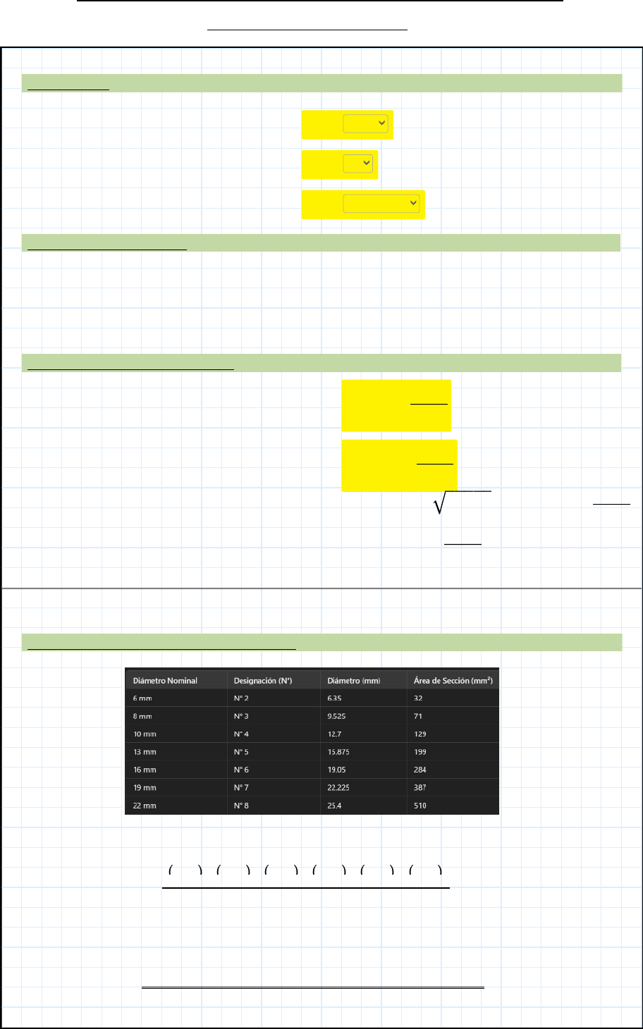 Diseño de Losa Aligerada Convencional Aplicación de la Norma E.060 1.0 Unidades Fuerza ≔Ψ1 tonf Longitud ≔Ψ2 m Esfuerzo ≔Ψ3 kgf/cm2 2.0 Parámetros de Diseño Factor de reducción a flexión ≔ϕf 0.90 Factor de reducción a corte ≔ϕc 0.85 3.0 Propiedades de los materiales Resistencia a la compresión del concreto ≔f'c 210 ―― kgf cm 2 Resistencia a la fluencia del acero ≔fy 4200 ―― kgf cm 2 Modulo de elasticidad del concreto ≔Ec =⋅15000 ‾‾‾‾‾⋅f'c Ψ3 217407.775 ―― kgf cm 2 Modulo de elasticidad del acero ≔Es 2000000 ―― kgf cm 2 Parámetro de reducción de Whitney =β1 0.85 4.0 Diámetros y áreas de acero comerciales ϕ#2 ((cm)) 0.64 ϕ#3 ((cm)) 0.95 ϕ#4 ((cm)) 1.27 ϕ#5 ((cm)) 1.59 ϕ#6 ((cm)) 1.91 ϕ#8 ((cm)) 2.54 A#2 ⎛⎝cm 2 ⎞⎠ 0.50 A#3 ⎛⎝cm 2 ⎞⎠ 0.71 A#4 ⎛⎝cm 2 ⎞⎠ 1.29 A#5 ⎛⎝cm 2 ⎞⎠ 2.00 A#6 ⎛⎝cm 2 ⎞⎠ 2.84 A#8 ⎛⎝cm 2 ⎞⎠ 5.10 Diseño de Losa Aligerada Convencional Aplicación de la Norma E.060 5.0 Dimensiones de la sección de aligerado ≔bf 40 cm ≔bw 10 cm ≔h 20 cm ≔hf 5 cm ≔r' 3 cm ≔d =-h r' 17 cm 6.0 Calculo del acero mínimo Calculo de inercia de la sección T ≔Iala =――― ⋅bf hf 3 12 416.667 cm 4 ≔Ialma =―――― ⋅bw ⎛⎝ -h hf⎞⎠ 3 12 2812.5 cm 4 ≔yb =―――――――――――――― +⋅⋅bf hf ⎛⎝ -h 0.5 hf⎞⎠ ⋅⋅bw ⎛⎝ -h hf⎞⎠ 0.5 ⎛⎝ -h hf⎞⎠ +⋅bf hf ⋅bw ⎛⎝ -h hf⎞⎠ 13.214 cm ≔yt =-h yb 6.786 cm ≔dala =--h 0.5 hf yb 4.286 cm ≔dalma =-yb 0.5 ⎛⎝ -h hf⎞⎠ 5.714 cm ≔Ig =+++Iala ⋅⎛⎝ ⋅bf hf⎞⎠ dala 2 Ialma ⋅⋅bw ⎛⎝ -h hf⎞⎠ dalma 2 11800.595 cm 4 Acero mínimo positivo ≔Spos =― Ig yb 893.018 cm 3 Modulo de sección (Zona inferior) ≔fr =⋅2 ‾‾‾‾‾⋅f'c Ψ3 28.988 ―― kgf cm 2 Esfuerzo de rotura ≔Mcr_pos =⋅Spos fr 0.259 ⋅tonnef m Momento critico (Zona inferior) ≔apos =-d ‾‾‾‾‾‾‾‾‾‾‾‾‾‾‾‾ -d2 ――――― ⋅⋅2 1.2 Mcr_pos ⋅⋅⋅ϕf 0.85 f'c bf 0.287 cm ≔Asmin_pos =―――――― ⋅1.2 Mcr_pos ⋅⋅ϕf fy ⎛ ⎜ ⎝ -d ―― apos 2 ⎞ ⎟ ⎠ 0.488 cm 2 Calculo del acero mínimo utilizando 1.2Mcr_pos ≔Asmin_E060 =⋅⋅――――― ⋅0.7 ‾‾‾‾‾⋅f'c Ψ3 fy bw d 0.411 cm 2 Calculo del acero mínimo según Norma E.060 Diseño de Losa Aligerada Convencional Aplicación de la Norma E.060 Acero mínimo negativo ≔Sneg =― Ig yt 1739.035 cm 3 Modulo de sección (Zona superior) ≔Mcr_neg =⋅Sneg fr 0.504 ⋅tonnef m Momento critico (Zona superior) ≔aneg =-d ‾‾‾‾‾‾‾‾‾‾‾‾‾‾‾‾ -d2 ――――― ⋅⋅2 1.2 Mcr_neg ⋅⋅⋅ϕf 0.85 f'c bw 2.382 cm ≔Asmin_neg =―――――― ⋅1.2 Mcr_neg ⋅⋅ϕf fy ⎛ ⎜ ⎝ -d ―― aneg 2 ⎞ ⎟ ⎠ 1.012 cm 2 Calculo del acero mínimo utilizando 1.2Mcr_neg 7.0 Calculo del acero máximo Acero máximo positivo ≔cb =0.588 d 9.996 cm ≔ab =⋅β1 cb 8.497 cm ≔Ccb =⋅⋅0.85 f'c ⎛⎝ +⋅⎛⎝ -bf bw⎞⎠ hf ⋅bw 0.5 d⎞⎠ 41.948 tonnef ≔Asb_pos =―― Ccb fy 9.988 cm 2 Acero balanceado positivo ≔Asmax_pos =⋅0.75 Asb_pos 7.491 cm 2 Acero máximo positivo Acero máximo negativo ≔Cc1 =⋅⋅⋅0.85 f'c ab bw 15.166 tonnef ≔Asb_neg =―― Cc1 fy 3.611 cm 2 Acero balanceado negativo ≔Asmax_neg =⋅0.75 Asb_neg 2.708 cm 2 Acero máximo negativo Diseño de Losa Aligerada Convencional Aplicación de la Norma E.060 8.0 Calculo del momento resistente Zona con Momento negativo ≔Asii 0.50 cm 2 Se debe controlar que el valor de "a" sea menor que h-hf debido a que cambie el comportamiento de la sección ≔aii =―――― ⋅Asii fy ⋅⋅0.85 f'c bw 1.176 cm ≔Mnii =⋅⋅Asii fy ⎛ ⎜ ⎝ -d ― aii 2 ⎞ ⎟ ⎠ 0.345 ⋅tonnef m =-h hf 15 cm =⋅ϕf Mnii 0.31 ⋅tonnef m Zona con Momento positivo ≔Ascc 0.50 cm 2 Se debe controlar que el valor de "a" sea menor que hf debido a que cambie el comportamiento de la sección ≔acc =―――― ⋅Ascc fy ⋅⋅0.85 f'c bf 0.294 cm =hf 5 cm ≔Mncc =⋅⋅Ascc fy ⎛ ⎜ ⎝ -d ―― acc 2 ⎞ ⎟ ⎠ 0.354 ⋅tonnef m =⋅ϕf Mncc 0.319 ⋅tonnef m Tabla 1:Momento resistentes para una losa aligerada de ,un peralte efectivo de =h 20 cm , un ancho de ala de vigueta de ,un ancho de vigueta de y =d 17 cm =bf 40 cm =bw 10 cm un concreto de .=f'c 210 ―― kgf cm 2 Acero mínimo negativo Acero mínimo positivo =Asmin_neg 1.012 cm 2 =Asmin_E060 0.411 cm 2 9.0 Capacidad a cortante ≔ϕVc =⋅⋅⋅⋅ϕc 1.1 0.53 ‾‾‾‾‾⋅f'c Ψ3 bw d 1.221 tonnef Diseño Losa Aligerada convencional en una dirección Aplicación de la Norma E . 060 * Columnas 60x60 * Vigas 30x60 A Consellerar plso terminado 100 kgf/m AconsideranC de 250 Kgf/mi & *Diseñar el tramo de 4 paños de losa alegerada Sección Tiplea o p bf consendonal [ 5 bf= no m ...... bw= 10a hf = 5cm & bu * vigrata tipla Bloque de relleno Malta o concreto & Datos del Material concreto fc = 210 Kgf/am? Aoro de refuerzo fy = 4200 Hof/n ↑ Nelezar Losa en una devedón de h= 20 cm ↑ retrado de corgas de la Viguete Para hacer el metrado se toma un ancho de Franja bf = 0 , 4 m Aligerado h= 0 , 2 m CM : OV : Pp = 300kg/mi s/c = 2504g/m2 Pot . = 100 kg/mP tof . = 150kg/m2 Metrado por vegreta CM : pp . alegrado300x=1 160 kgmp . Terminado CV: 25040 ,42100 A carge ultima y en servido : (destienda lenealmente) Las losas se diseñan para cargos de gravedad comb : 1 . 4 CM + 107 CV (E . 60) Wu = 1 . 4 (1601 + 1 . 7 /100)=400 kg/m poliguete WS = 1 (160) + 1 (100) = 260 kg/ve por unguete ~ Anales Estructural . Considerando Apoyo fijo en ambos extremos (Elemento Frame -Secont) w & to ↳ - E 5m 4 . 7un 407m 5m & ... ↑ Alternada para la carga Ure. Estado de Carga 1 : CVL w w · · ① Estado de Carga 2 : CVC M w w unvud & · Estado de Carga 3 : CV 3 w ·Un ① Estado de Carga 4 : CVY & ·mu Estado de Carga 5 : CV5 w & · ·MuL Aráleses utellsando el metodo de coefuentes . mayor 1/II mayor //10 W
