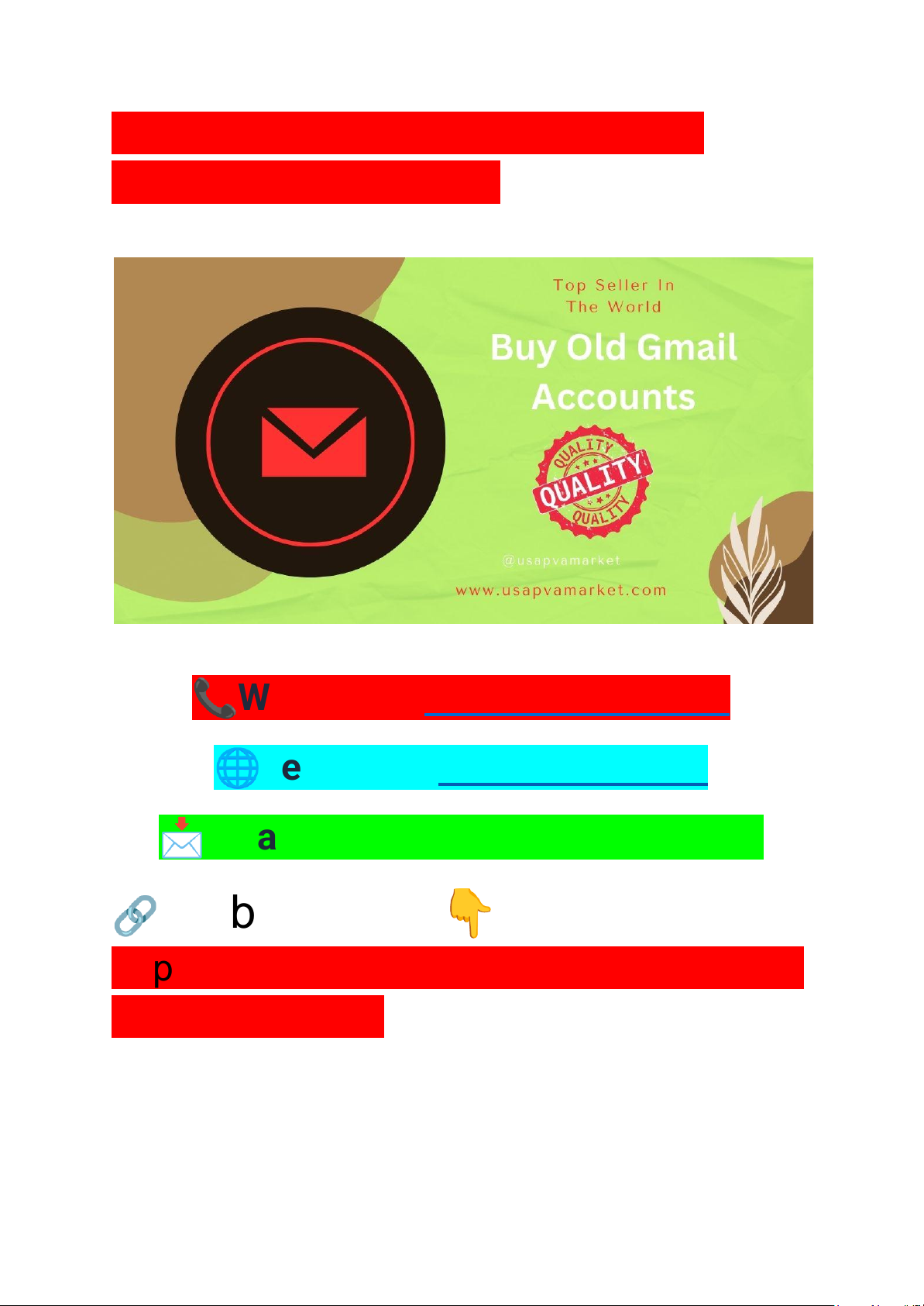 Buy Old Gmail Accounts for Sale Europe | 100% Secure 📞Whatsapp: +1 (929) 802-2279 🌐Telegram: @usapvamarket 📩Email: usapvamarket@gmail.com 🔗 website Link 👇 https://usapvamarket.com/product/buy-old -gmail-accounts/ Buy Gmail Accounts in Bulk If you need to buy Gmail accounts in bulk for multiple online operations such as professional communication, networking, ads campaign and https://wa.me/+19298022279 https://t.me/usapvamarket https://emojipedia.org/thumbs-up others, place your order right now. We have a great store of the Gmail accounts you can buy Gmail accounts in bulk from usapvamarket.com Our Account Details & Offers- ● Created manually ● Recovery email added ● Have stability for social service ● We sell new and old accounts ● All country Gmail accounts available ● Each account price is very cheap ● 100% replacement within 3 days ● 100% Customer satisfaction guaranteed Please contact us first. And if you have any questions ask us we will try to answer your questions. contact us. Whatsapp: +1 (929) 802-2279 Telegram: @usapvamarket Buy Old Gmail Accounts https://wa.me/+19298022279 https://t.me/usapvamarket A Gmail account offers versatile email services for both personal and professional use. It provides a user-friendly interface and strong security features. With Gmail, you can manage emails, schedule tasks, and integrate with various Google services. Embrace Gmail for efficient communication and organization in your daily life. Gmail offers many features for businesses. It has a custom email address with your domain name. Buy old Gmail accounts. This helps your business look professional. Gmail helps you manage emails easily. Emails can be sorted into different folders. Gmail’s search function is very powerful. It helps you find any email quickly. Gmail works well with other Google services. This makes sharing files easy. Google Photos can be used to send pictures. All these services are connected in one place. Buy old Gmail accounts. This makes your work simpler and faster. This means you can save many emails and files without worry. How to set up a Gmail accounts perfectly? To create a Gmail, fill in your personal details like name, username, and password. Ensure your password is strong and unique. Follow the prompts to complete the setup. After creating your account, go to the settings menu. Adjust your inbox layout and choose how you want emails to be sorted. Set up a signature for your emails. Manage your privacy settings and decide who can see your information. Buy Gmail accounts in bulk for gaining multi-purpose opportunities. https://usapvamarket.com/product/buy-old-gmail-accounts/ What is Gmail and how Gmail evaluated? Gmail started in 2004. It was created by Google. Gmail changed email forever. It offered 1 GB of storage. Most email services at the time offered only a few megabytes. Gmail’s user-friendly interface attracted many users. Over the years, Google added more features. These include spam filtering and search capabilities. The service is now one of the most popular email platforms in the world. Buy Gmail accounts in bulk. A Gmail account offers robust features for personal and professional communication. With its extensive storage capacity and search capabilities, users can easily access and manage their emails. Buy USA Gmail accounts. Businesses benefit from custom domain emails and professional tools via Google Workspace. Gmail’s mobile app ensures accessibility on the go, making it a versatile choice for all users. Why Gmail is called as the versatile player of online applications? Unlock the potential of Gmail accounts for your e-commerce, trading, and payment management needs. Leverage its features to streamline operations. Enhance security, improve communication, and boost efficiency. Embrace Gmail’s capabilities to stay ahead in the competitive market. Start maximizing the benefits of Gmail today for seamless business management. Gmail helps manage customer emails easily. https://usapvamarket.com/product/buy-old-gmail-accounts/ With advanced security measures, businesses can trust Gmail to protect sensitive information. The ability to create labels and filters helps manage emails efficiently. Gmail’s powerful search functionality allows users to find emails quickly, saving valuable time. Buy Gmail accounts at usapvamarket.com Gmail helps you keep all your payment receipts in one place. You can create labels to sort receipts by month or vendor. That’s why Gmail is the versatile player. Why users worldwide buy Gmail accounts? Buy Gmail accounts at usapvamarket.com Gmail accounts offer significant benefits for e-commerce, trading, and payment management. They streamline communication, improve organization, and enhance productivity. Gmail has become a vital tool for various online activities, including e-commerce, trading, and payment management. Its user-friendly interface and robust features make it ideal for businesses. Gmail helps manage customer emails easily. It organizes emails into categories. This means important emails are never missed. Templates save time for common responses. Custom signatures add a professional touch. Gmail makes tracking transactions easy. Emails get categorized automatically. Labels help in organizing trade information. Filters sort emails efficiently. Buy USA Gmail accounts at usapvamarket.com https://usapvamarket.com/product/buy-old-gmail-accounts/ Buy Old Gmail Accounts How old Gmail accounts assist in building professional communication? An old Gmail account has higher visibility. This is because it has existed for a long time. People trust older accounts more. They are less likely to be spam. Search engines may also rank older accounts higher. This leads to better networking opportunities. Old Gmail accounts have a long connection history. This helps in maintaining stronger relationships. This is useful for personal and professional connections. People feel more comfortable reconnec