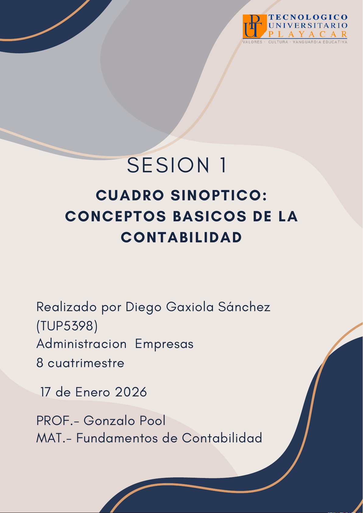 CUADRO SINOPTICO: CONCEPTOS BASICOS DE LA CONTABILIDAD SESION 1 Realizado por Diego Gaxiola Sánchez (TUP5398) PROF.- Gonzalo Pool MAT.- Fundamentos de Contabilidad Administracion Empresas 8 cuatrimestre 17 de Enero 2026 CONCEPTOS BÁSICOS Y FUNDAMENTOS DE LA CONTABILIDAD Conceptos Básicos Fines de la Contabilidad Código de Ética Profesional Definición: Técnica para registrar, clasificar y resumir las operaciones financieras de una entidad. Activo: Recursos y bienes que posee la empresa (lo que tiene). Pasivo: Deudas y obligaciones con terceros (lo que debe). Informativo: Conocer la situación financiera y los resultados de operación. Control: Vigilar los recursos y obligaciones para evitar fugas o errores. Toma de Decisiones: Proveer datos exactos para planear el futuro del negocio. Integridad: Ser honesto y transparente en todos los juicios profesionales. Objetividad: No permitir prejuicios o conflictos de interés. Confidencialidad: Respetar la privacidad de la información del cliente. Legal: Dictada por códigos de comercio y leyes mercantiles. Fiscal: Requisito indispensable para el pago de impuestos y cumplimiento tributario. Financiera: Necesaria para obtener créditos bancarios o atraer inversionistas. Normativa (NIF / NIFF) NIF (Locales): Normas de Información Financiera que regulan la elaboración de estados financieros. NIIF (Internacionales): Estándares globales para la transparencia y comparabilidad internacional. Postulados Básicos: Sustancia económica, entidad económica, devengación contable, entre otros. Capital/Patrimonio: Inversión de los dueños más utilidades (lo que queda). Ingresos: Entradas de recursos por ventas o servicios. Gastos: Salidas de recursos para la operación del negocio. Legal: Servir como prueba ante autoridades y terceros. Competencia: Mantener el conocimiento actualizado para dar un servicio de calidad. Obligatoriedad
