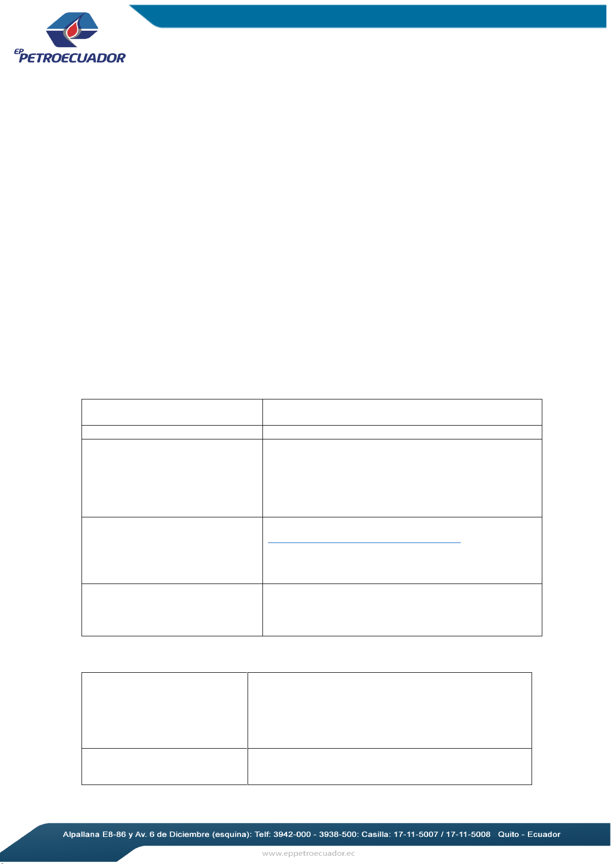 Página 1 de 3 AVISO DE CONTRATACIÓN PÚBLICA PREVISTA/FUTURA La EP PETROECUADOR, con la finalidad de dar cumplimiento a lo establecido en: 1. Apéndice 4, Anexo XII del “ACUERDO COMERCIAL ENTRE LA UNIÓN EUROPEA Y SUS ESTADOS MIEMBROS POR UNA PARTE, Y COLOMBIA, EL PERÚ Y ECUADOR, POR OTRA”, así como a su Guía Práctica para su Aplicación, notificada mediante Circular Nro. SERCOP-SERCOP-2018-0003-C de 28 de agosto de 2018; 2. “ACUERDO COMERCIAL ENTRE EL REINO UNIDO DE GRAN BRETAÑA E IRLANDA DEL NORTE, POR UNA PARTE Y LA REPÚBLICA DE COLOMBIA, LA REPÚBLICA DEL ECUADOR Y LA REPÚBLICA DEL PERÚ POR OTRA” y Oficio Nro. MPCEIP-DMPCEIP-2021-0067-0 de 24 de enero de 2021, notificados mediante Circular Nro. SERCOP-SERCOP-2021-0001-C de 02 de febrero de 2021; 3. Apéndice 10, Anexo XVII del “ACUERDO DE ASOCIACIÓN ECONÓMICO INCLUSIVO ENTRE LA REPÚBLICA DEL ECUADOR Y LA ASOCIACIÓN EUROPEA DE LIBRE COMERCIO (AELC - EFTA)”; Oficio Nro. MPCEIP-DMPCEIP-2021-0067-0 de 24 de enero de 2021; notificados mediante Circular Nro. SERCOP-SERCOP-2021- 0001-C de 02 de febrero de 2021; Procedió con la revisión del CPC y el umbral del Presupuesto Referencial, por lo que, expide el siguiente aviso de contratación pública prevista/futura: DATOS DE LA ENTIDAD CONTRATANTE NOMBRE DE LA ENTIDAD CONTRATANTE: Empresa Pública de Hidrocarburos del Ecuador - EP PETROECUADOR RUC: 1768153530001 DOMICILIO: País: Ecuador Provincia: Pichincha Cantón: Quito Parroquia: Benalcázar Dirección: Calle Alpallana E8-30 y Avenida Diego de Almagro, edificio Plaza Lavi CONTACTOS: Correo Electrónico: Elizabeth.Chasipanta@eppetroecuador.ec Teléfono: (593-2)2993700 ext. 17220 (Elizabeth Chasipanta - Funcionario encargado del proceso). COSTO POR EDICIÓN DE DOCUMENTACIÓN DEL PROCESO DE CONTRATACIÓN CUBIERTA: USD $ 0,00 No se cobrará por costo de edición de documentación INFORMACIÓN DE LA CONTRATACIÓN: OBJETO DE LA CONTRATACIÓN: "PÓLIZA DE SEGURO COLECTIVO DE VIDA, ACCIDENTES PERSONALES, VIDA- DEUDORES (DESGRAVAMEN) Y RIESGOS CATASTRÓFICOS, PARA TODO EL PERSONAL DE EP PETROECUADOR” CÓDIGO DEL PROCEDIMIENTO: LS-EPP-2020896-21 mailto:Elizabeth.Chasipanta@eppetroecuador.ec Página 2 de 3 CÓDIGO CPC: 713200511 que corresponde a “SEGURO EN GRUPO DE VIDA” PRESUPUESTO REFERENCIAL: USD 6,000.000.00 TIPO DE PROCEDIMIENTO DE CONTRATACIÓN PÚBLICA A APLICAR: Licitación de Seguros DESCRIPCIÓN DE OPCIONES: No aplica INFORMACIÓN PARA OBTENER TODOS LOS DOCUMENTOS RELEVANTES RELACIONADOS CON LA CONTRATACIÓN: Se deberá verificar el proceso en el portal de compras públicas: https://www.compraspublicas.gob.ec/ProcesoContrata cion/compras/PC/buscarProceso.cpe?sg=1 TIPO DE ADQUISICIÓN: Licitación de Seguros COMPRENDERÁ SUBASTA INVERSA ELECTRÓNICA: No COMPRENDERÁ UNA NEGOCIACIÓN: No aplica CANTIDAD DE LA MERCANCÍA O SERVICIO OBJETO DE LA CONTRATACIÓN: Revisar las condiciones establecidas en el pliego del proceso de contratación. PLAZO DE EJECUCIÓN: El plazo de ejecución del contrato es de 730 días a partir del 9 de agosto de 2021 a las 00:00:01 IDIOMA PARA LA PRESENTACIÓN DE OFERTAS : Español FECHA LÍMITE PARA LA PRESENTACIÓN DE OFERTAS: De acuerdo al cronograma establecido en el pliego del proceso de contratación y en el portal institucional del SERCOP. FORMA Y DIRECCIÓN PARA LA PRESENTACIÓN DE LAS OFERTAS La oferta se presentará de manera digital, conforme las condiciones que constan en la convocatoria y el pliego que regirá la contratación, con firma electrónica a través del Sistema Oficial de Contratación del Estado -SOCE-. El precio de la misma siempre deberá subirse a través del SOCE, hasta la fecha que se cierre el plazo para la presentación de la oferta (el cronograma estará disponible una vez publicado el procedimiento en dicho sistema). CONDICIONES DE PAGO: Los pagos se realizarán conforme a lo descrito en el Pliego del proceso. https://www.compraspublicas.gob.ec/ProcesoContratacion/compras/PC/buscarProceso.cpe?sg=1 https://www.compraspublicas.gob.ec/ProcesoContratacion/compras/PC/buscarProceso.cpe?sg=1 Página 3 de 3 CONDICIONES PARA LA PARTICIPACIÓN DE LOS PROVEEDORES: Las condiciones y demás requisitos se encuentran establecidas en el pliego del proceso de contratación. SELECCIÓN DE UN NÚMERO DE PROVEEDORES CALIFICADOS PARA LA INVITACIÓN: No aplica Quito, D.M, 12 de julio de 2021 Zulay Morejón E. SUBGERENTE DE LOGISTICA Y ABASTECIMIENTO, ENC. EMPRESA PÚBLICA DE HIDROCARBUROS DEL ECUADOR EP PETROECUADOR 2021-07-12T20:05:33-0500 ZULAY DEL ROCIO MOREJON ESPINOSA