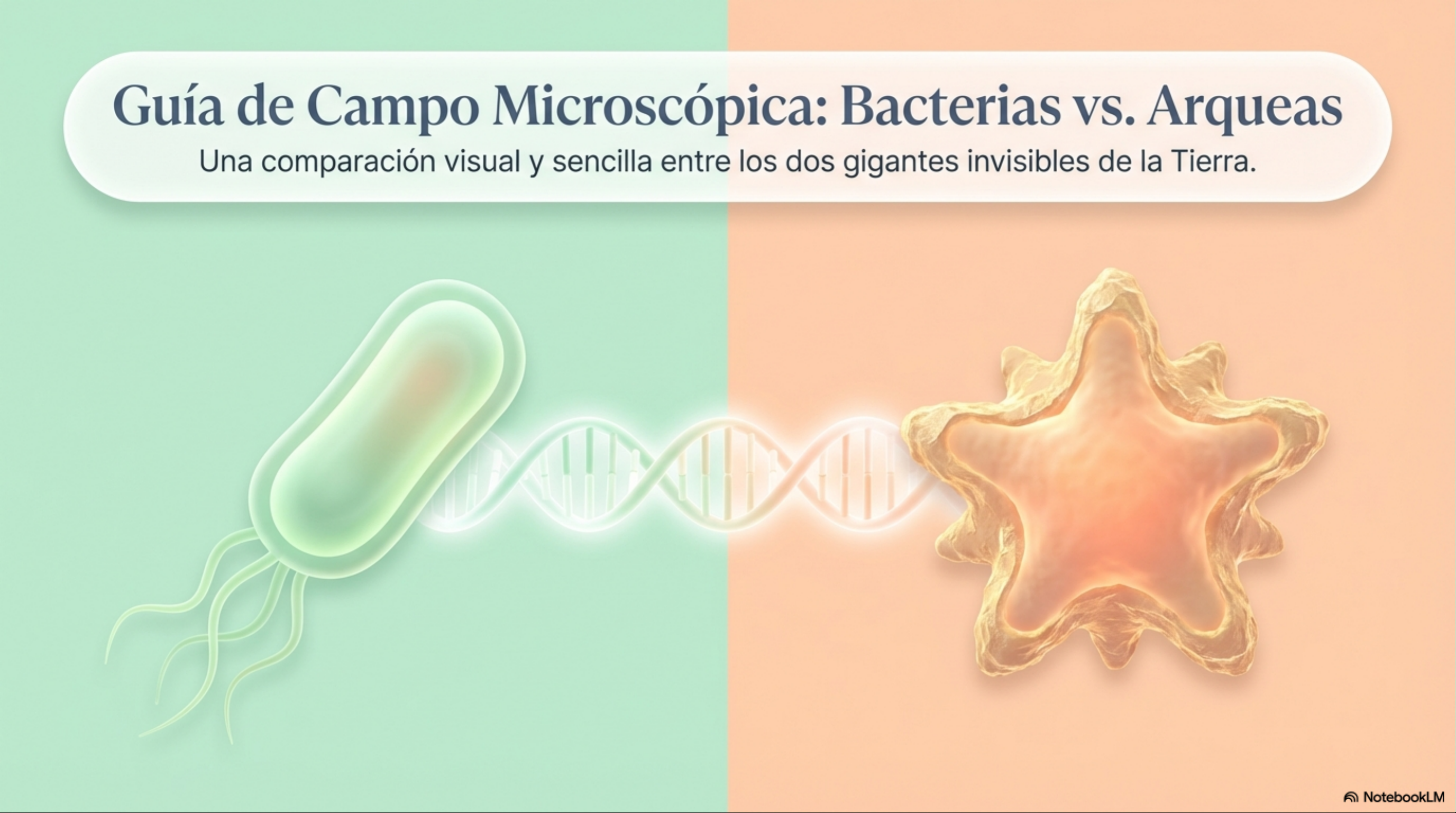 Guía de Campo Microscópica: Bacterias Arqueas Una comparación visual y sencilla entre los dos gigantes invisibles de la Tierra. NotebookLMEl Árbol de la Vida: Un Origen Común Hace unos 3.700 millones de años, la vida en la Tierra se dividió en dos grandes caminos evolutivos. Aunque hoy no los podamos ver a simple vista, estos dos grupos originaron toda la diversidad Dominio biológica de nuestro planeta. EUKARYA (Nosotros) Dominio Dominio BACTERIA ARCHAEA LUCA: Último Antepasado Común Universal. La primera célula de la cual desciende toda la vida. LUCA Dominio: La categoría más alta y amplia para clasificar a los seres vivos.Conociendo a las Bacterias Son los organismos más abundantes del planeta. Viven en el suelo, en el agua y dentro de nosotros. Son fábricas químicas microscópicas que pueden adaptarse a casi cualquier entorno normal. Cápsula Pared Celular Membrana Plasmática Flagelo i Glossary Tooltip Nucleoide (ADN) Ubicuo: Que está presente en todas partes al mismo tiempo. A NotebookLMConociendo a las Arqueas Fueron descubiertas mucho después porque suelen vivir en los lugares más hostiles de la Tierra. Aunque bajo el microscopio parecen bacterias, químicamente son una forma de vida completamente distinta. Nucleoide (ADN) Membrana Plasmática Única Membrana Plasmática Flagelo Arqueano i Glossary Tooltip Extremófilo: Un organismo que ama Pared Celular y necesita vivir en condiciones extremas (mucho calor, sal ácido) (Sin Peptidoglicano) donde otros morirían. NotebookLMEl Espejismo: ¿En qué se parecen? Durante siglos, la ciencia las agrupó juntas porque comparten estas características visuales y biológicas básicas. Sin núcleo verdadero Organismos unicelulares Bacterias Arqueas ADN en forma circular Se reproducen dividiéndose en dos Glossary Tooltip i Procariota: Célula primitiva y sencilla que no tiene su ADN encerrado en un núcleo. Fisión Binaria: Proceso de reproducción donde una célula simplemente se parte en dos mitades iguales. NotebookLMLa Gran División: El Secreto Genético Durante años se creyó que formaban un solo reino Bacteria (Monera). Sin embargo, en 1977, el científico Carl Woese analizó su "código de barras" genético interno descubrió que las Arqueas son tan diferentes de las Bacterias como un humano lo es de un hongo. Archaea i Glossary Tooltip rRNA 16S: Una molécula dentro de la célula que funciona como un "reloj evolutivo". Al leerla, los científicos pueden ver qué tan emparentados están dos seres vivos. NotebookLMLa Frontera Celular: Membranas Plasmáticas La "piel" de las células está hecha de grasas (lípidos), pero el "pegamento" químico que las une es totalmente distinto, lo que permite a las arqueas resistir ambientes extremos. Bacterias Arqueas Ester Ether Enlaces Éster Enlaces Éter (Cadenas rectas) (Cadenas ramificadas) Bicapa lipídica Monocapa lipídica (Resiste el calor) Glossary Tooltip i Enlace Éster Éter: Tipos de "pegamento" químico. El enlace Éter (Arqueas) es mucho más resistente al calor extremo. Monocapa lipídica: Una barrera sólida de una sola pieza, exclusiva de las arqueas, que evita que se derritan a altas temperaturas. NotebookLMLa Armadura: La Pared Celular Casi todas las bacterias usan el mismo material básico para construir su armadura protectora. Las arqueas usan materiales diferentes, lo que las hace inmunes a los antibióticos comunes. Antibiótico Peptidoglicano Pseudopeptidoglicano / S Peptidoglicano: Una malla fuerte de azúcares y aminoácidos. Fármacos como la penicilina actúan destruyendo esta malla (por eso solo matan i bacterias). S: Una coraza exterior hecha de proteínas cristalizadas, en las arqueas. A NotebookLMEl ADN: Un Parentesco Sorprendente Aunque las arqueas tienen el cuerpo de una bacteria, su maquinaria genética interna para leer copiar el ADN es casi idéntica a la de las células de los animales las plantas. Bacterias Arqueas Eukarya (Nosotros) ¿ADN envuelto en Histonas? ¿Intrones en los genes? Tipo de ARN Polimerasa 1 tipo (Simple) Varios tipos Varios tipos (Compleja) (Compleja) Glossary Tooltip i Histonas: 'Carretes' especiales donde el ADN se enrolla para no enredarse. ARN polimerasa: La 'máquina' que lee el código del ADN. NotebookLMDiversidad Metabólica: ¿Cómo se alimentan? Las bacterias son las campeonas de la versatilidad: algunas incluso 'comen' luz solar igual que las plantas. Las arqueas no hacen fotosíntesis, pero tienen un superpoder exclusivo: crear gas metano. BACTERIAS Fotosíntesis Quimiotrofia Materia Orgánica ARQUEAS Metanogénesis (Exclusivo) Quimiotrofia Glossary Tooltip i Metanogénesis: El proceso de producir gas metano (CH4) como desecho al generar energía. En toda la Tierra, solo ciertas arqueas pueden hacer esto. NotebookLMHábitat: Del día día los extremos Ambos dominios conviven pacíficamente en el suelo en tus intestinos. Sin embargo, cuando las condiciones se vuelven mortales (agua hirviendo 0 acidez extrema), las arqueas reinan en solitario. Ambientes Cotidianos Ambientes Extremos Glossary Tooltip i Hipertermófilo: Organismo que crece felizmente en agua por encima de los Halófilo: Organismo que necesita concentraciones masivas de sal para sobrevivir. NotebookLMPatogenicidad: ¿Nos enferman? Las bacterias tienen una doble vida: la inmensa mayoría nos mantienen vivos, pero una fracción causa enfermedades. Por el contrario, la ciencia no ha encontrado ni una sola arquea que cause enfermedades. Héroes Villanos (Bacterias) Vecinos Pacíficos (Arqueas) ! Zero ! La mayoría beneficiosas, Cero patógenos conocidos en pero algunas peligrosas. humanos, animales plantas. Glossary Tooltip: i Patógeno: Cualquier microorganismo que invade un huésped y le causa una enfermedad. NotebookLMMatriz Comparativa (Parte 1: Estructura Genética) Un resumen definitivo de las diferencias biológicas fundamentales. BACTERIAS ARQUEAS Pared Celular Contiene Peptidoglicano Sin Peptidoglicano (Capa S) Lípidos de Membrana Enlaces