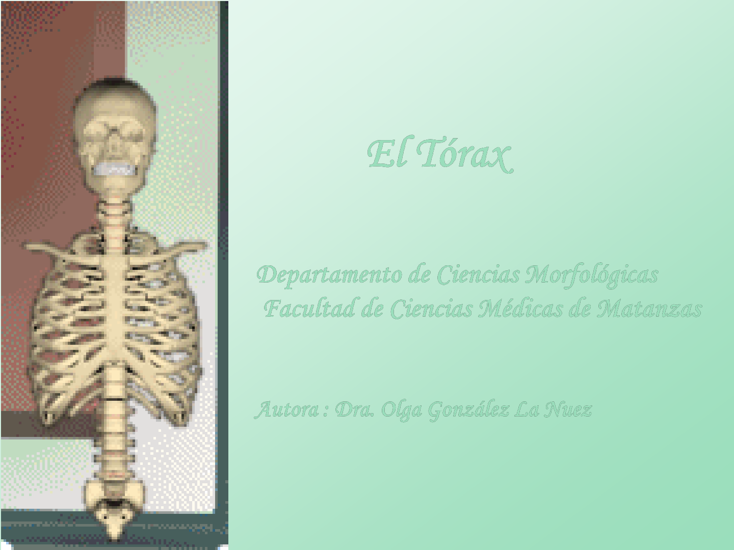 * * * El Tórax Departamento de Ciencias Morfológicas Facultad de Ciencias Médicas de Matanzas Autora : Dra. Olga González La Nuez * * * El Tórax está conformado por el esternón, hueso impar situado ventral y medialmente en la caja toráxica y por doce pares de costillas, las que articuladas por delante con el esternón y por detrás con la columna toráxica, conforman la caja toráxica, en la cual están localizados importantes órganos del aparato respiratorio y cardiovascular. En su conjunto el tórax tiene forma cónica con la base hacia abajo, truncado en su parte alta por la apertura toráxica superior, en su base presenta la apertura toráxica inferior, la cual está cerrada por el diafragma. En la parte anterior de la apertura, entre el esternón y los cartílagos costales se conforma el ángulo esternocostal, el cual varía su amplitud según el tipo constitucional. En el canal cervico torácico o apertura superior del tórax ocurren variaciones anatómicas desde el nacimiento a la adultez. Al nacer, el borde superior del manubrio esternal se halla a la altura de la primera vértebra torácica, para en la edad adulta, encontrarse a la altura de la segunda o tercera vértebra de dicha región Este hecho condiciona un estrechamiento del canal comprometiendo el espacio entre la primera costilla y los músculos escálenos anterior y medio, por lo que las raíces del plexo braquial y la arteria subclavia (elementos anatómicos situados en este espacio), son más vulnerables a la compresión, lo cual puede ser una de las causas del llamado Síndrome de compresión neurovascular. * * * * * * El esternón es un hueso impar localizado en la pared toráxica anterior. Consta de los siguientes detalles anatómicos. En los bordes laterales del cuerpo presenta incisuras para las articulaciones con los cartílagos costales a partir del II. El proceso xifoides presenta múltiples variantes, en este caso es horadado, pero puede ser bífido etc. * * * Las costillas: Son doce pares, de modo general son huesos que presentan un especto arqueado y se disponen en sentido oblicuo de atrás hacia delante y ligeramente hacia abajo. Se caracterizan por terminar en su extremo anterior en un cartílago mediante el cual se articulan con el esternón, las primeras 7 lo hacen directamente y por ello son llamadas costillas verdaderas, la VIII, IX y X lo hacen mediante un cartílago común, por ello son denominadas falsas, las dos ultimas costillas no presentan cartílago y no se articulan con el esternón y por lo que se les conoce como flotantes. Cada costilla consta de cabeza, cuello y cuerpo, (en la intersección del cuello con el cuerpo se encuentra el tubérculo costal), a continuación del tubérculo, en el sitio en que la costilla cambia su dirección se encuentra el ángulo costal. Se describen dos bordes, uno superior más redondeado y otro inferior más afilado, presenta dos caras, una lateral y una medial, en esta última se encuentra el surco subcostal, lugar donde se alojan los vasos intercostales * * * Vista anterior Vista posterior * * * Costilla desde una vista posterior * * * Para la descripción de los detalles anatómicos hay que tener en cuenta que existen costillas con características especiales, como son la I, II, XI y XII. La I costilla como se observará en la lámina que sigue, presenta dos caras, una superior y otra inferior, siendo por tanto sus bordes lateral y medial respectivamente, además en su cara superior se describen surcos y tubérculos. En la cabeza no se presenta la cresta divisoria por lo que posee una sola faceta articular. La II costilla ya va reuniendo las características generales de las costillas tipos, asumiendo su cuerpo una posición oblicua, describiéndose una cara supero lateral en la cual se observa el tubérculo de origen del músculo serrato anterior y una cara inferomedial. Las costilla XI y XII no presentan ángulo, además de no poseer en su cabeza la cresta divisoria en dos faceta articulares, tampoco poseen tuberosidad pues no se articulan con los procesos transversos de las vértebras toráxicas. De modo general son cosillas más pequeñas. * * * Vista superior * * * Costillas XI y XII Son las llamadas costillas flotantes, porque no se articulan al esternón * * * Articulaciones del tórax 1. Articulaciones del esternón a. Con la clavícula b. Con las costillas 2. Articulaciones de las costillas con la columna vertebral a. Costo vertebrales b. Costo transversarias Se describe dentro de las articulaciones del cinturón del miembro superior, no obstante podemos decir que es sinovial y compleja por la presencia de un disco. Las 7 primeras se articulan directamente con el esternón, la I mediante una sincon- drosis, las restantes son sinoviales, sus cápsulas conformadas por el pericondrio que se continúa con el periostio del esternón Se articula la cabeza de la costilla con dos vértebras contiguas, excepto la I, XI y XII. Son sinoviales. Se producen entre las facetas de los tubérculos costales con las de los procesos transversos de las vértebras toráxicas, son sinoviales. * * * Articulación esternoclavicular y su disco Articulaciones esternocostales * * * Costo vertebrales Faceta articular del proceso transverso para la articulación costo transversaria. * * * * * * Costo vertebral Costotransversaria * * * Como características generales del tórax, podemos señalar además de los apuntes realizados al inicio, otros detalles que lo caracterizan, como son por ejemplo los espacios intercostales. Es importante señalar también que entre la columna vertebral y los arcos costales (especialmente la región de los ángulos) se forma un canal, canal paravertebral, ocupado por músculos profundos del dorso. La forma y dimensiones del tórax varía con la edad y los caracteres constitucionales de las personas, los niños a medida que se van creciendo van aumentando los diámetros transversales toráxicos, acercándose a las dimensiones de los adult