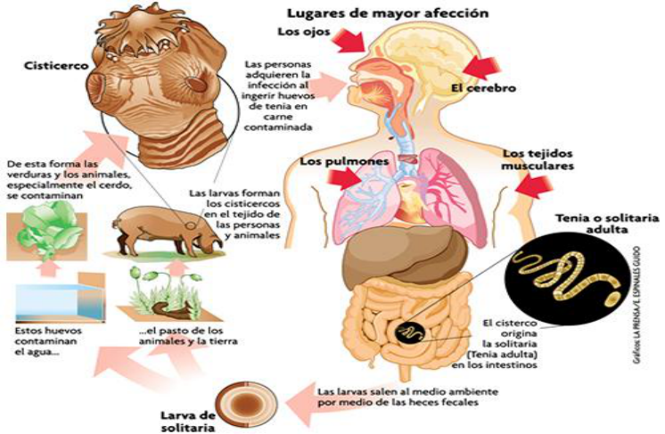 40 CISTICERCOSIS Definición: - Infección producida por cisticercos - En el hombre: Cisticercus cellulosae, metacestodo o forma larval de la Taenia solium, que normalmente infecta al cerdo, pero también infecta al hombre. Biología: - Los cisticercos provienen de los huevos producidos por el parásito adulto (solitaria) tras ser ingeridos por humanos o cerdos. - Los cisticercos se convierten en solitarias al ser ingeridos por los humanos en carne de cerdo insuficientemente cocinada. - Las solitarias viven en los intestinos de los humanos y producen cientos de miles de huevos que se expulsan al medio ambiente. -Dado que el humano es el único hospedero de la solitaria, y el humano y el cerdo los principales hospederos de los cisticercos, la prevalencia de la teniasis/cisticercosis depende exclusivamente del vínculo que la humanidad establece consigo misma y con el cerdo. Patología: En el ser humano, los cisticercos se localizan con mayor frecuencia en: -músculos esqueléticos - sistema nervioso - ojos - tejido graso subcutáneo corazón La neurocisticercosis puede adoptar distintas formas según: - la localización - el número - el estado biológico del parásito -el grado y tipo de inflamación del tejido del huésped - Y las estructuras neurales afectadas. Síntomas: -La sintomatología resultará de la combinación de estos diferentes factores y casi cualquier síntoma relacionado con la afección del sistema nervioso central podrá presentarse. - La neurocisticercosis puede no causar síntoma alguno pero, cuando los causa, suelen ser: - dolor de cabeza -convulsiones en grados variables de severidad -trastornos de la visión -vomito -alteraciones psiquiátricas -demencia -perdida de la conciencia. Diagnóstico: -Su diagnóstico es generalmente imposible de realizar considerando únicamente los criterios clínicos aunque ciertos cuadros en zona endémica son orientadores. -En zonas endémicas, éste diagnóstico deberá siempre ser considerado frente a un paciente con epilepsia de inicio tardío (después de 25 años) o frente a un paciente con hipertensión endocraneal." -Visualización de parásitos cerebrales, según se muestra en imágenes de tomografía computarizada y resonancia magnética Epidemiología: -El principal factor de riesgo para adquirir cisticercosis, es la presencia del portador de T. solium en la casa o en el ambiente cercano. -Sin embargo, no debe descuidarse la posible contaminación de verduras y frutas y la protección que el cuidadoso lavado de los alimentos otorga contra la cisticercosis además de otras enfermedades Las medidas de control identificadas han demostrado que se puede prevenir y posiblemente erradicar la cisticercosis Vacunas: -En infecciones parasitarias causadas por céstodos en humanos, la situación sugiere que algunas vacunas pueden ser efectivas. -La infección por Taenia solium en humanos y cerdos muestra signos de ser vulnerable a la intervención inmunológica -Diferentes antígenos del parásito, provenientes de las distintas fases de su desarrollo, han demostrado reducir la tasa de infección y la carga parasitaria en los cerdos vacunados y desafiados en condiciones experimentales ... -El status de "vacuna" requiere ser efectivamente demostrado en prevenir la enfermedad naturalmente adquirida en condiciones realistas de transmisión . -Todavía no se dispone de una vacuna efectiva Tratamiento: La neurocisticercosis humana es extremadamente variable en cuanto a: -tiempo de evolución -Edad -sexo -número, localización y estado de los parásitos cerebrales Lo que resulta en sintomatologías y respuestas al tratamiento también variables. -Hay una gran variación de resultados terapéuticos probablemente asociados al pleomorfismo de la Neurocisticercosis, lo que a su vez obliga a diferentes esquemas terapéuticos. -El fármaco cisticida de elección es el albendazol (15 a 30 mg/kg/día durante 8 días), por su bajo costo, mayor permeabilidad de la barrera hematoencefálica y no interacción con corticoesteroides. -Quedando como alternativa secundaria el praziquantel (50 mg/kg/día durante 15 días) Prevención: Primera etapa -Taenia a Huevo Medio Rural -Tratar al teniásico conocido -Buscar al teniásico silencioso -Examinar las heces -Persuadir al teniásico de tratamiento -Reclutar la participación de personajes locales para los programas de difusión, educación y acción (médicos, profesores, curas, ediles, lideres estudiantiles, jefes de familia) Medio Urbano -Mismo tratamiento que en medio rural -Atención especial con el empleado doméstico y vendedor de alimentos (cocinera, jardinero, albañil ) en cuanto a diagnóstico, tratamiento y seguimiento de parásitos intestinales Segunda etapa Huevo a Cisticerco Medio Rural -No alimentar cerdos con heces -Amarrar o confinar a los cerdos -No defecar a ras de suelo -Enterrar las heces, instalar letrinas, conectar el drenaje -No regar con aguas negras -Vacunar al cerdo al tercer mes de edad -Sanear el suelo -Beber agua hervida -Lavarse las manos -Lavar verduras y alimentos -El teniásico es un riesgo social itinerante y debe insistirse en su tratamiento, no es aconsejable que viaje ni maneje alimentos Segunda etapa Huevo a Cisticerco Medio Urbano -Uso de letrinas o pozo y/o drenaje domiciliar -Agua potable o hervir el agua de beber -Pisos de material en domicilio -Educación familiar y del personal doméstico sobre higiene personal y domiciliaria -Educar en el uso de sanitarios -Búsqueda y tratamiento de teniasicos en el círculo familiar y profesional -Perseverancia en la cultura de la higiene personal y de los alimentos -Reducción del consumo de alimentos en puestos callejeros urbanos Tercera etapa Cisticerco a Taenia Medio Rural -Diagnosticar cerdos -Inspección macroscópica tras la matanza -Dar tratamiento al cerdo -Cocinar cabalmente al cerdo -Diagnosticar cerdos -Inspección macroscópica tras la matanza -Dar tratamiento al cerdo -Cocinar cabalmente al cerdo
