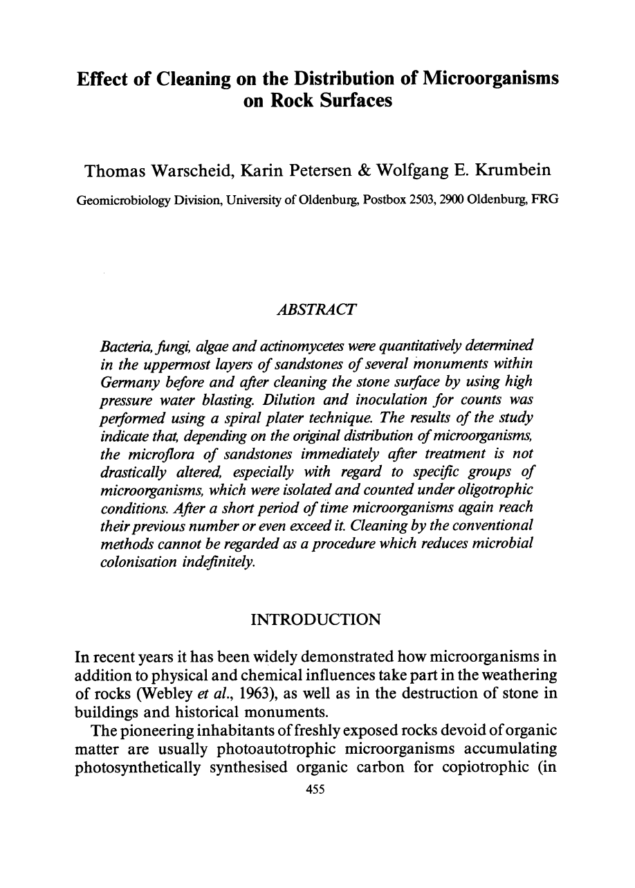 Effect of Cleaning on the Distribution of Microorganisms on Rock Surfaces Thomas Warscheid, Karin Petersen & Wolfgang E. Krumbein Geomicrobiology Division, University of Oldenburg, Postbox 2503, 2900 Oldenburg, FRG ABSTRACT Bacteria, fungi, algae and actinomycetes were quantitatively detennined in the uppermost layers of sandstones of several monuments within Germany before and after cleaning the stone surface by using high pressure water blasting. Dilution and inoculation for counts was performed using a spiral plater technique. The results of the study indicate that, depending on the original distribution of microorganisms, the microfiora of sandstones immediately after treatment is not drastically altered, especially with regard to specific groups of microorganisms, which were isolated and counted under oligotrophic conditions. After a short period of time microorganisms again reach their previous number or even exceed it. Cleaning by the conventional methods cannot be regarded as a procedure which reduces microbial colonisation indefinitely. INTRODUCTION In recent years it has been widely demonstrated how microorganisms in addition to physical and chemical influences take part in the weathering of rocks (Webleyet al., 1963), as well as in the destruction of stone in buildings and historical monuments. The pioneering inhabitants of freshly exposed rocks devoid of organic matter are usually photoautotrophic microorganisms accumulating photosynthetically synthesised organic carbon for copiotrophic (in 455 D. R. Houghton et al. (eds.), Biodeterioration 7 © Elsevier Science Publishers Ltd 1988 456 Thomas Warscheid, Karin Petersen, Wolfgang E. Krumbein nature zymogenous) and oligotrophic heterotrophs, which in tum supply sulphur bacteria and nitrifying bacteria with energy sources, such as hydrogen sulphide and ammonia (Krumbein, 1973). However, only in distinct microhabitats are microorganisms able to attack the mineral-surface more vigorously than abiotic aggressive compounds. Beneath the excretion of enzymes, protons, inorganic and organic acids and complex forming agents microorganisms accumulate dissolved cations in their cells leading to a continuously steady state in the weathering process which ends in the destruction ofthe rock-forming mineral (Beveridge, 1984). Nevertheless the mere occurrence of microorganisms on stone surfaces does not automatically imply destructive action. But these rock- populations may be involved in enhancing abiotic processes or lead to the formation of algae and microbial mats, which may in tum build surface crusts, to the aesthetic detriment of historic monuments. In conservation it is common practice to clean stone surfaces by high pressure water blasting in order to remove biogenic layers and crusts and to prepare the stone for further treatment, such as rendering it hydrophobic. This report represents results concerning the effectiveness of this procedure to reduce the numbers of microorganisms attached to the stone surface and subsurface and its influence on the distribution and re- settlement of these microorganisms. MATERIALS AND METHODS Samples Specimens with typical deterioration characteristics of the following monuments were analysed: Marien-Church, Ge1nhausen-Quartzitic Lower Triassic-Sandstone. S I-with algae layer and some crustose lichens on the solid stone surface; S 3-exfoliating stone surface covered with crustose lichens; S 2 and S 4-same as S 1, S 3 reinspected immediately after washing. St. Lorenz-Church, Nuemberg-Quartzitic 'Burg'-Sandstone. S 5-Black crust on solid stone surface; S 7 -thick algae carpet; some crustose lichens on solid stone surface; S 6 and S 8-same as S 5, S 7 reinspected between 1 and 2 weeks after washing. St. Matthias-Church, Trier-Quartzitic Lower Triassic-Sandstone. S 9 with black-shaped algae layer on solid stone surface; S lO-sample site comparable to S 9 about 5 weeks after washing. Distribution of microorganisms on rock surfaces after cleaning 457 'Alte Pinakothek', Munich-carbonaceous Cretaceous-Sandstone (,Gruensandstein,). S II-black crust with underlying crumbly stone surface; S 12-sample site comparable to S 11 about 8 weeks after washing. Sampling Incisions were cut about 2-3 mm deep in an area of3 X 3 cm ofthe stone surface using a drill with a diamond wheel. Samples were removed with a stone chisel. Approximately 109 of material was collected in sterile petri- dishes and analysed one day after collection. Culture media Copiotrophic, chemoorganotrophic bacteria: DEV Gelatine-Agar (Merck, Darmstadt W.G., Nr. 10685). Oligotrophic, chemoorganotrophic bacteria: DEV Gelatine-Agar (same as above, but diluted 1/50) and Bunt & Rovira's medium. Nitrifying bacteria: media submitted by Bock (personal communication). Copiotrophic fungi: Sabauraud 4% Maltose-Agar (Merck, Darmstadt W.G., Nr. 5439). Oligotrophic fungi: Sabauraud 4% Maltose-Agar (as above, but diluted 1/50) and Czapek-Dox-Agar (Merck, Darmstadt W.G., Nr 5460 but diluted 1/50). Algae and cyanobacteria: BG ll-Medium. Actinomycetes: Glycerol-nitrate-casein-agar (but diluted 1/50). Inoculation, incubation and enumeration Sample material was carefully powdered in a hand mortar, suspended in sterile 0·001 % Tween 80-solution (10%; w/v) and shaken continuously for 1 h. Chemoorganotrophic bacteria and fungi as well as actinomycetes were inoculated using the modified spiral plater technique of Lewis et aZ. (1985). Nitrifying bacteria, algae and cyanobacteria were inoculated as prescribed for the MPN method. The inoculated samples were incubated at 28°C in the case of chemoorganotrophic bacteria, fungi, actinomycetes and nitrifying bacteria and at 16°C in light (about 1000 lux) in the case of algae and cyanobacteria. Counting, of the chemoorganotrophic bacteria, fungi and actinomycetes according to the Spiral Plater procedure was carried out 2 weeks after inoculation. Nitrifying bacteria were enumerated 6 weeks, algae and cyanobacteria 8 weeks after ino