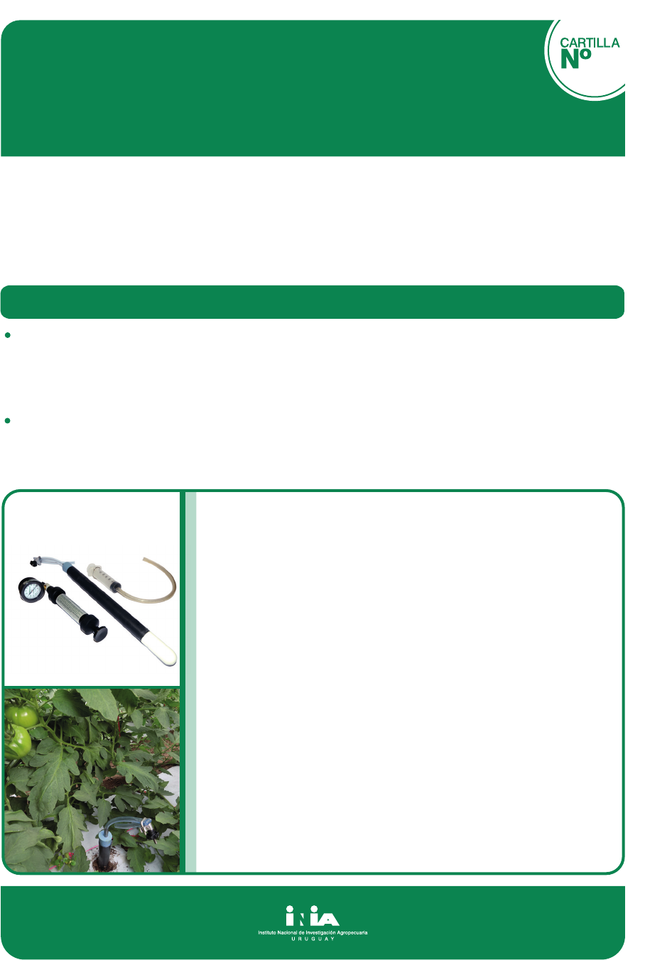 90MONITOREO DE NUTRIENTES PARA EL CORRECTOMANEJO DEL FERTIRRIEGO Programa Nacional de Investigación en Producción Hortícola En los sistemas de producción hortícola bajo invernadero en Uruguay, el manejo del fertirriego se basa en la experiencia de técnicos y productores, quienes deben decidir cuándo y cuánto regar y fertilizar. En la mayoría de los casos no se utilizan herramientas que permitan cuantificar la disponibilidad de nutrientes para tomar estas decisiones. Esto dificulta el manejo preciso, aplicando dosis excesivas o deficitarias. El correcto manejo del agua y los nutrientes permite mejorar la productividad de los cultivos, siendo más eficientes en el uso de los recursos, a la vez de reducir el impacto ambiental. Un fertirriego eficiente permite satisfacer los requerimientos de los cultivos, reduciendo las pérdidas por lavado y fijación de nutrientes en el suelo. Para ello es necesario, compatibilizar los requerimientos de las plantas en los distintos estados de desarrollo del cultivo con los aportes realizados a través del sistema de riego. La investigación de INIA en fertirriego tiene como objetivo: ajustar herramientas que contribuyan a mejorar la toma de decisiones respecto a las necesidades de riego y nutrientes. Priorizar las herramientas que sean sencillas y prácticas, pudiendo ser utilizadas por técnicos o productores a nivel predial. FERTIRRIEGO Marzo 2020 Ing. Agr. Cecilia Berrueta, Ing. Agr. Rafael Grasso, Téc. Marcelo Falero MONITOREO DE NUTRIENTES EN LA ZONA EXPLORADA POR RAÍCES SONDAS PARA EXTRACCIÓN DE SOLUCIÓN DE SUELO Número: mínimo 3 sondas por invernadero de 1000 m . Extracción de solución: aplicar vacío 12 h mínimo después del fertirriego, esperar 12 h para extraer la solución de la sonda. Medidas en la solución: se puede medir directamente con medidores rápidos o se envía al laboratorio. Permite una buena medición de: Conductividad eléctrica, pH, Nitrato (NO ), Potasio (K ), Fosfato (H PO ) y Sodio (Na ). Permite una aceptable medición (alteración menor del 15%) para: Calcio (Ca ), Magnesio (Mg ), Amonio (NH ) y Cloruro (Cl ). No permite una correcta medición de: Bicarbonato (HCO ) y Sulfato (SO ). 2 3 - + 2 4 +- 2+ 2+ 4 -+ 3 - 4 2- MONITOREO DE NUTRIENTES EN LAS PLANTAS SENSORES ION ESPECÍFICOS Marzo 2020 ta ta 3 + 2+ + - MEDICIONES DE NUTRIENTES EN SAVIA OBTENIDA DE PECÍOLOS Muestreo: sacar 10-20 hojas por invernáculo. Las hojas deben ser nuevas, pero completamente desarrolladas (en tomate 4 o 5 hoja desde el ápice). Se recomienda muestrear entre 7 y 9 a.m. Procesamiento: eliminar folíolos y cortar pecíolos en trozos de 1 cm. Obtener la savia presionando con prensa de ajo. Medir inmediatamente con medidores rápidos. Interpretación de resultados: comparar con niveles críticos según estado fenológico (Hochmuth et al., 2015). Visualizar tendencias en el tiempo. Mediciones: calibrar los sensores con las soluciones estándar. Colocar muestra en el lector. La medición lleva un minuto. Se mide directamente sin añadir ningún reactivo. Muestras: soluciones de fertirrigación, soluciones de suelo y savia de plantas. Medidas individuales de: Nitrato (NO ), Potasio (K ), Calcio (Ca ), Sodio (Na ), Conductividad eléctrica y pH. MEDICIÓN DE NUTRIENTES EN SOLUCIONES NUTRITIVAS, SOLUCIÓN DE SUELO Y SAVIA EN PLANTAS