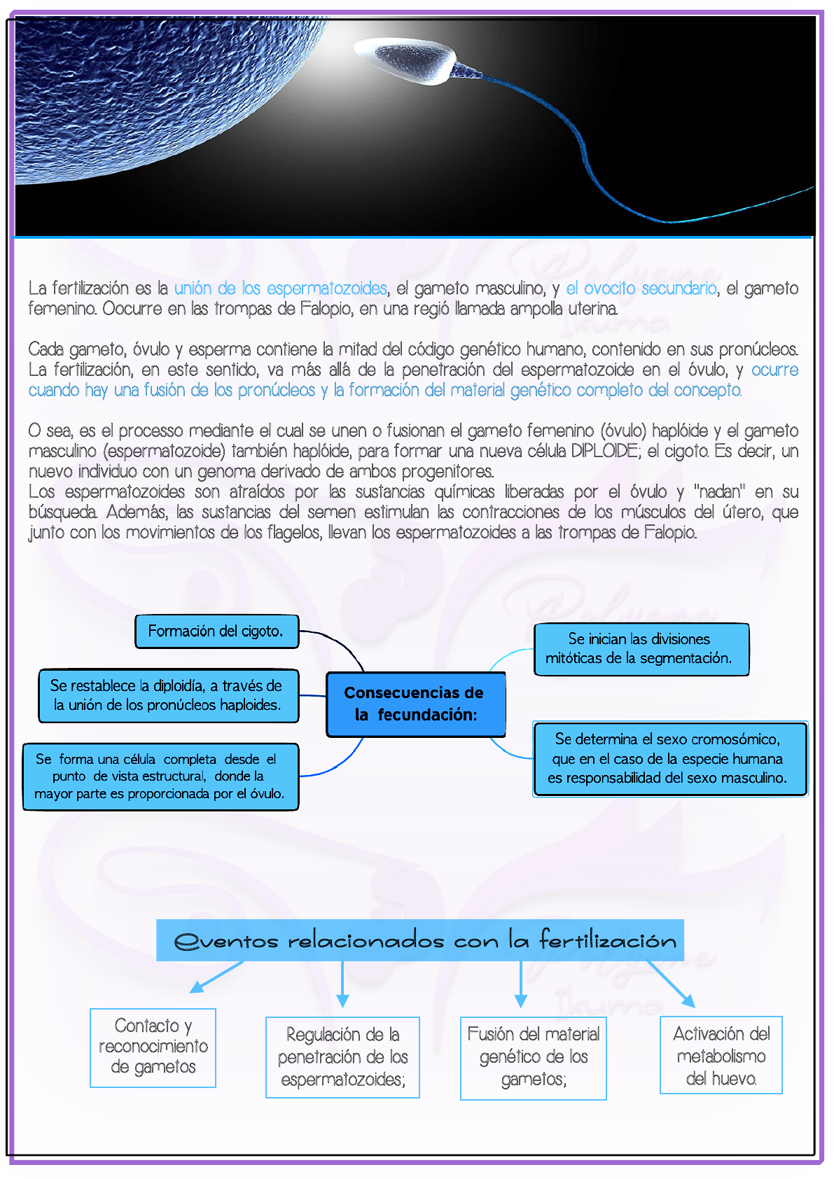 Fecundación La fertilización es la unión de los espermatozoides, el gameto masculino, y el ovocito secundario, el gameto femenino.. Oocurre en las trompas de Falopio, en una regió llamada ampolla uterina.. Cada gameto, óvulo y esperma contiene la mitad del código genético humano, contenido en sus pronúcleos.. La fertilización, en este sentido, va más allá de la penetración del espermatozoide en el óvulo, y ocurre cuando hay una fusión de los pronúcleos y la formación del material genético completo del concepto. O sea, es el processo mediante el cual se unen o fusionan el gameto femenino (óvulo) haplóide y el gameto masculino (espermatozoide) también haplóide, para formar una nueva célula DIPLOIDE; el cigoto. Es decir, un nuevo individuo con un genoma derivado de ambos progenitores.. Los espermatozoides son atraídos por las sustancias químicas liberadas por el óvulo y "nadan" en su búsqueda.. Además, las sustancias del semen estimulan las contracciones de los músculos del útero, que junto con los movimientos de los flagelos, llevan los espermatozoides a las trompas de Falopio.. Eventos relacionados con la fertilización Contacto y reconocimiento de gametos Regulación de la penetración de los espermatozoides; Fusión del material genético de los gametos; Activación del metabolismo del huevo. El complejo liberado durante la ovulación está constituido por: Ovocito Todo el material necesario para el inicio del crecimiento y desarrollo se almacena en el ovocito. Durante la ovulación, el óvulo se expulsa junto con la zona pelúcida y la corona radiada. El líquido presente en el antro del folículo maduro también será expulsado para ayudar a la entrada de ese ovocito en las trompas uterinas. El óvulo se transporta lentamente a través de la ampolla y, bajo la influencia de la progesterona, puede ingresar al istmo de las trompas uterinas. Este transporte ocurre por las contracciones musculares en la región y por los cilios presentes en estas trompas uterinas. ¿Cómo se transporta el ovocito? Espermatozóide Capa formada por glicoproteínas que se produce durante el período de crecimiento del ovocito y se deposita en su Ovocito; Formada por células foliculares que permanecem adheridas al ovócito y salen durante la ovulación siguiendo al ovocito; Zone pelúcida: Corona Radiata: Cambio del espermatozóide para la fecundación: La cola La pieza media Compacta su ADN para permitir que la cabeza (donde se almacena el ADN sea lo más pequeña posible y pueda moverse mejor y atravesar la zona pelúcida (cubierta del óvulo). Formada por células foliculares que permanecem adheridas al ovócito y salen durante la ovulación siguiendo al ovocito; posee una elevada cantidad de mitocondrias para mantener la energía en alto nivel. Esto ofrece al espermatozoide una gran eficiencia en el consumo de energía. En el proceso de eyaculación, los espermatozoides salen del hombre y entran en la vagina, desde donde inician la segunda parte de su recorrido hasta la fecundación.. Durante este camino, se encuentran con una gran cantidad de barreras que dificultarán su llegada a las trompas de Falopio, donde se encuentra el óvulo.. Tras la eyaculación, empieza una carrera no solo de velocidad sino también de resistencia.. Algunos espermatozoides quedarán en el camino. por las barreras, que son: Acción inmunológica, PH de la vagina, moco cervical y Barreras físicas. Fases de la fecundación: Penetración de la corona radiada El proceso de fecundación se inicia con la penetración de los espermatozoides a través de la capa de células que rodea el óvulo: la corona radiada. Los espermatozoides consiguen atravesar esta capa gracias a la liberación de la enzima hialuronidasa y el movimiento de su flagelo (la cola). Se necesita más de un espermatozoide para lograr degradar la zona pelúcida, aunque solo uno podrá entrar en el óvulo. Para atravesar esta barrera, la cabeza del espermatozoide establece contacto con el receptor ZP3 de la zona pelúcida del óvulo. Esto desencadena la reacción acrosómica. Penetración de la zona pelúcida Cuando el espermatozoide entra en contacto con l a membrana p l asmát ica de l óvu lo , se desencadenan 3 procesos distintos en el gameto femenino: La formación del cono de fecundación, la despolarización instantánea de su membrana y la liberación de gránulos corticales al espacio perivitelino. La formación del cono de fecundación permite la fusión de la membrana del óvulo con la del espermatozoide para que la cabeza del espermatozoide pueda entrar. A su vez, gracias a la despolarización de la membrana del óvulo y a la liberación de gránulos corticales, se evita la entrada de otro espermatozoide. Fusión de membranas Fusión de núcleos y formación del cigoto Con la entrada del espermatozoide, el óvulo se activa para terminar la meiosis, proceso que permite la reducción del número de cromosomas. Así, se libera el segundo corpúsculo polar y los cromosomas se colocan formando una estructura denominada pronúcleo femenina.. Una vez ambos pronúcleos se encuentran uno junto al otro, ocurre la fusión de ambos.. Esto supone que las membranas de ambos pronúcleos desaparezcan para que sus cromosomas puedan juntarse y que la célula restablezca su dotación cromosómica, es decir, 46 cromosomas en total. Todo este proceso de la fecundación culmina con la formación del cigoto humano. En la fecundación si estabelece si el sexo del bebé. Cigoto masculino: sus cromosomas sexuales son XY. Cigoto femenino: sus cromosomas sexuales son XX El óvulo siempre es portador del cromosoma X.. Por tanto, el sexo del embrión se definirá según si el espermatozoide es portador de un cromosoma X o un cromosoma Y. La fecundación es un conjunto de procesos el cual el gameto masculino y el gameto femenino, (ambos células haploides) se unen para formar una solo célula diploide llamada: cigoto. Esta célula dará origen a un nuevo o