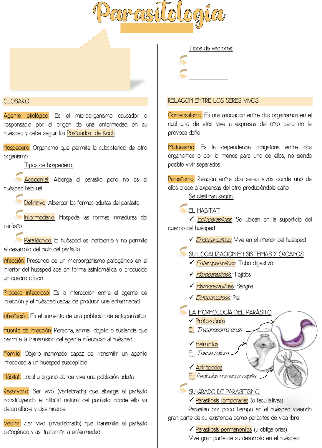 PARASITOLOGÍA MÉDICA - 2º AÑO GLOSARIO Agente etiológico: Es el microorganismo causador o responsable por el origen de una enfermedad en su huésped y debe seguir los Postulados de Koch Hospedero: Organismo que permite la subsistencia de otro organismo Tipos de hospedero: Accidental: Alberga el parasito pero no es el huésped habitual Definitivo: Albergar las formas adultas del parásito Intermediario: Hospeda las formas inmaduras del parásito Paratécnico: El huésped es ineficiente y no permite el desarrollo del ciclo del parásito Infección: Presencia de un microorganismo patogénico en el interior del huésped sea en forma asintomática o producido un cuadro clínico Proceso infeccioso: Es la interacción entre el agente de infección y el huésped capaz de producir una enfermedad Infestación: Es el aumento de una población de ectoparásitos Fuente de infección: Persona, animal, objeto o sustancia que permite la transmisión del agente infeccioso al huésped Fomite: Objeto inanimado capaz de transmitir un agente infeccioso a un huésped susceptible Hábitat: Local u órgano donde vive una población adulta Reservorio: Ser vivo (vertebrado) que alberga el parásito constituyendo el hábitat natural del parásito donde ello va desarrollarse y diseminarse Vector: Ser vivo (invertebrado) que transmite el parásito patogénico y así transmitir la enfermedad Tipos de vectores: Vector mecánico: Solamente hace el transporte Vector biológico: Transporta y hace parte de alguna etapa del ciclo biológico del parásito RELACION ENTRE LOS SERES VIVOS Comensalismo: Es una asociación entre dos organismos en el cual uno de ellos vive a expresas del otro pero no le provoca daño. Mutualismo: Es la dependencia obligatoria entre dos organismos o por lo menos para uno de ellos, no siendo posible vivir separados Parasitismo: Relación entre dos seres vivos donde uno de ellos crece a expensas del otro produciéndole daño Se clasifican según: EL HABITAT Ectoparasitosis: Se ubican en la superficie del cuerpo del huésped Endoparasitosis: Vive en el interior del huésped SU LOCALIZACIÓN EN SISTEMAS Y ÓRGANOS Enteroparasitosis: Tubo digestivo Histoparasitosis: Tejidos Hemoparasitosis: Sangre Ectoparasitosis: Piel LA MORFOLOGÍA DEL PARÁSITO Protozoários Ej: Trypanosoma cruzi Helmintos TEj: aenia solium Artrópodos Ej: Pediculus humanus capitis SU GRADO DE PARASITISMO Parasitosis temporarias (o facultativas) Parasitan por poco tiempo en el huésped viviendo gran parte de su existencia como parásitos de vida libre Parasitosis permanentes (u obligatorias) Vive gran parte de su desarrollo en el huésped G E N E R A L I D A D E S = Es el estudio del fenómeno del parasitismo ejercido por microorganismos, animales o vegetales que viven a expensas de otros organismos (huéspedes) PARASITOLOGÍA MÉDICA - 2º AÑO RELACIÓN HUÉSPED – PARÁSITO - El huésped se defiende frente al parásito resultando en una acción patogénica con aparición de síntomas y signos clínico - En algunos casos el huésped puede ser asintomático a la parasitosis y convertirse en una fuente de infección. - Es importante conocer el CICLO BIOLÓGICO del parásito para comprender como combatirlo EPIDEMIOLOGÍA: Estudia la distribución de las enfermedades y sus factores de riesgo con la intención de comprender la prevalencia de algunas enfermedades en ciertas regiones o en diferentes clases socio económicas CICLO BIOLÓGICO: Conjunto de etapas que un organismo debe sufrir para asegurar la continuidad de su especie. Ciclo directo (MONOXÉNICO): Parasita una sola especie para desarrollarse Ciclo indirecto (DIHETEROXÉNICO): Necesita parasitar dos especies para desarrollarse Factores que intervienen en el desarrollo de un proceso infeccioso: AGENTE ETIOLÓGICO RESERVÓRIO DEL AGENTE MODO DE SALIDA DEL AGENTE DEL RESERVÓRIO MECANISMOS DE TRANSMISIÓN (Reservorio – Huésped) Vía Cutánea Vía Sanguínea Vía Oral Vía Nasal MODO DE ENTRADA DEL AGENTE EN EL HUESPED Contaminación fecal. Contaminación ambiental. Carnivorismo. Vectorial. Transfusional. Trasplacentario. Transplante de órganos SUCEPTIBILIDAD DEL HUÉSPED Edad Mecanismos de Defensa: o Externos: PIEL/PELOS/ SEBO o Internos: INMUNIDAD o Adquiridos: VACUNAS/ ANTIBIÓTICOS Nutrición Hábitos y costumbres Mecanismos de Acción de los parásitos: Acción Mecánica: Cuando el parasito obstruye algunas regiones o órganos Acción Traumática: Cuando hay daño a los tejidos Acción Infecciosa o Vectora: Puede contaminar otros tejidos debido al desplazamiento del parásito Acción Expoliativa: Consumo sustancias nutritivas necesarias para el huésped Acción Tóxica: Liberación de metabolitos tóxicos Acción Inmunoalérgica: Formación de alergias Efectos Neoplásticos: Formación de tumor/cáncer Factores que determinan la agresividad del parásito: Virulencia: Cantidad de agentes que infectan el huesped Resistencia del huesped Diagnóstico: De certeza: Se observa uma forma del parásito Patognomónico: Presencia de alguno elemento propio de una especie Sugerente: A través del resultado de exámenes que orientan el diagnóstico (IgG/ IgE) Tratamiento: Antiparásitos: Protozoarios: metronidazol, tinidazol Helmintos: mebendazol, albendazol, nitazoxanida, ivermectina Prevención Educación sanitaria Saneamiento básico Control de vectores