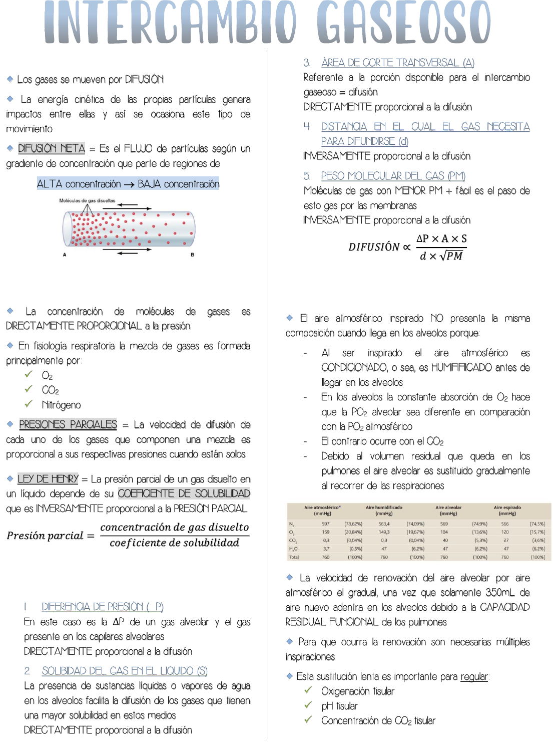 CAP 40 – GUYTON FISIOLOGÍA HUMANA – 2º AÑO Difusión gaseosa Los gases se mueven por DIFUSIÓN La energía cinética de las propias partículas genera impactos entre ellas y así se ocasiona este tipo de movimiento DIFUSIÓN NETA = Es el FLUJO de partículas según un gradiente de concentración que parte de regiones de ALTA concentración → BAJA concentración PRESIONES DE GASES EN UNA MEZCLA de gases La concentración de moléculas de gases es DIRECTAMENTE PROPORCIONAL a la presión En fisiología respiratoria la mezcla de gases es formada principalmente por: ✓ O2 ✓ CO2 ✓ Nitrógeno PRESIONES PARCIALES = La velocidad de difusión de cada uno de los gases que componen una mezcla es proporcional a sus respectivas presiones cuando están solos LEY DE HENRY = La presión parcial de un gas disuelto en un líquido depende de su COEFICIENTE DE SOLUBILIDAD que es INVERSAMENTE proporcional a la PRESIÓN PARCIAL 𝑃𝑟𝑒𝑠𝑖ó𝑛 𝑝𝑎𝑟𝑐𝑖𝑎𝑙 = 𝑐𝑜𝑛𝑐𝑒𝑛𝑡𝑟𝑎𝑐𝑖ó𝑛 𝑑𝑒 𝑔𝑎𝑠 𝑑𝑖𝑠𝑢𝑒𝑙𝑡𝑜 𝑐𝑜𝑒𝑓𝑖𝑐𝑖𝑒𝑛𝑡𝑒 𝑑𝑒 𝑠𝑜𝑙𝑢𝑏𝑖𝑙𝑖𝑑𝑎𝑑 Fatores que afectan la difusión gaseosa 1. DIFERENCIA DE PRESIÓN (ΔP) En este caso es la ΔP de un gas alveolar y el gas presente en los capilares alveolares DIRECTAMENTE proporcional a la difusión 2. SOLIBIDAD DEL GAS EN EL LIQUIDO (S) La presencia de sustancias líquidas o vapores de agua en los alveolos facilita la difusión de los gases que tienen una mayor solubilidad en estos medios DIRECTAMENTE proporcional a la difusión 3. ÁREA DE CORTE TRANSVERSAL (A) Referente a la porción disponible para el intercambio gaseoso = difusión DIRECTAMENTE proporcional a la difusión 4. DISTANCIA EN EL CUAL EL GAS NECESITA PARA DIFUNDIRSE (d) INVERSAMENTE proporcional a la difusión 5. PESO MOLECULAR DEL GAS (PM) Moléculas de gas con MENOR PM + fácil es el paso de esto gas por las membranas INVERSAMENTE proporcional a la difusión 𝐷𝐼𝐹𝑈𝑆𝐼Ó𝑁 ∝ ΔP × A × S 𝑑 × ξ𝑃𝑀 Composición del aire atmosférico y aire alveolar El aire atmosférico inspirado NO presenta la misma composición cuando llega en los alveolos porque: - Al ser inspirado el aire atmosférico es CONDICIONADO, o sea, es HUMIFIFIICADO antes de llegar en los alveolos - En los alveolos la constante absorción de O2 hace que la PO2 alveolar sea diferente en comparación con la PO2 atmosférico - El contrario ocurre con el CO2 - Debido al volumen residual que queda en los pulmones el aire alveolar es sustituido gradualmente al recorrer de las respiraciones La velocidad de renovación del aire alveolar por aire atmosférico el gradual, una vez que solamente 350mL de aire nuevo adentra en los alveolos debido a la CAPACIDAD RESIDUAL FUNCIONAL de los pulmones Para que ocurra la renovación son necesarias múltiples inspiraciones Esta sustitución lenta es importante para regular: ✓ Oxigenación tisular ✓ pH tisular ✓ Concentración de CO2 tisular CAP 40 – GUYTON FISIOLOGÍA HUMANA – 2º AÑO AIRE EXPIRADO = AIRE DEL ESPACIO MUERTO + AIRE ALVEOLAR Regulación de o2 en los alveolos La concentración y presión O2 en los alveolos es regulada por: ✓ Absorción de O2 por la sangre ✓ Entrada de O2 nuevo en los pulmones por la ventilación En situaciones de demanda de O2 la difusión de esto gas es . Para que la PO2 alveolar alcance su valor optimo (104mmHg) es necesario un de la ventilación y en algunos esto aumento resulta en HIPERVENTILACIÓN Regulación de Co2 en los alveolos La concentración y presión CO2 en los alveolos es regulada por la entrada de CO2 por la ventilación, pero esta relación es INVERSAMENTE PROPORCIONAL UNIDAD RESPIRATÓRIA LOBULILLO RESPIRATORIO (unid. Respiratoria) Bronquiolo respiratorio Conducto alveolar Atrios alveolares alveolos Todas estas regiones de la unidad respiratoria hacen INTERCAMBIO GASEOSO y presentan una MEMBRANA RESPIRATORIA compuesta por: 1. CAPA DE LIQ. SURFACTANTE 2. EPITELIO ALVEOLAR (neumocitos) 3. MEMBRANA BASAL 4. ESPACIO INTERSTICIAL 5. MEMBRANA BASAL DEL CAPILAR 6. ENDOTELIO CAPILAR Fatores que afectan la difusión gaseosa en la memb. respiratoria 1. ESPESURA DE LA MEMBRANA INVERSAMENTE proporcional a la difusión Ejemplos de de la espesura: EDEMA o FIBROSIS. 2. ÁREA DE SUPERFICIE Ejemplos de de la área de superficie: ENFISEMA DIRECTAMENTE proporcional a la difusión 3. COEFICIENTE DE DIFUSIÓN DEL GAS DIRECTAMENTE proporcional a la difusión 4. DIFERENCIA DE PRESIÓN PARCIAL(ΔP) Es referente a la diferencia de presión parcial del gas en los 2 lados de la membrana respiratoria Capacidad de difusión de la membrana respiratoria ➔ Capacidad de difusión del O2 21 mL/min/mmHg Pero la diferencia de presión de O2 en la membrana durante una respiración tranquila es de 11mmHg Así siendo, considerando su presión, la capacidad de difusión de O2 es de: 21 mL/min/mmHg X 11 mmHg = 230 mL/min ➔ Capacidad de difusión del O2 durante el ejercicio físico 65mL/min/mmHg Esto aumento ocurre debido: ✓ Abertura de varios capilares pulmonares (pulmón se comporta como zona 3) ✓ Aumento de la VENTILACIÓN/PERFUSIÓN ➔ Capacidad de difusión del CO2 La difusión de CO2 ocurre + rápido debido su coeficiente de difusión (20x + difusible que el O2) 400mL/min/mmHg CAP 40 – GUYTON FISIOLOGÍA HUMANA – 2º AÑO ➔ Capacidad de difusión del CO2 durante el ejercicio físico 1200 mL/min/mmHg Coeficiente ventilación perfusión = 𝑉𝑒𝑛𝑡𝑖𝑙𝑎𝑐𝑖ó𝑛 𝑎𝑙𝑣𝑒𝑜𝑙𝑎𝑟 (𝑉𝑎) 𝑃𝑒𝑟𝑓𝑢𝑠𝑖ó𝑛 (𝑄) PERFUSIÓN Las presiones de O2 y CO2 es = al valor de sus presiones parciales en la sangre (40 y 45mmHg respectivamente) Proporción Va/Q = ZERO NO HAY INTERCAMBIO GASEOSO VENTILACIÓN VENTILACIÓN NO hay CO2 traído por la sangre Proporción Va/Q = INFINITO NO HAY INTERCABIO GASEOSO PERFUSIÓN