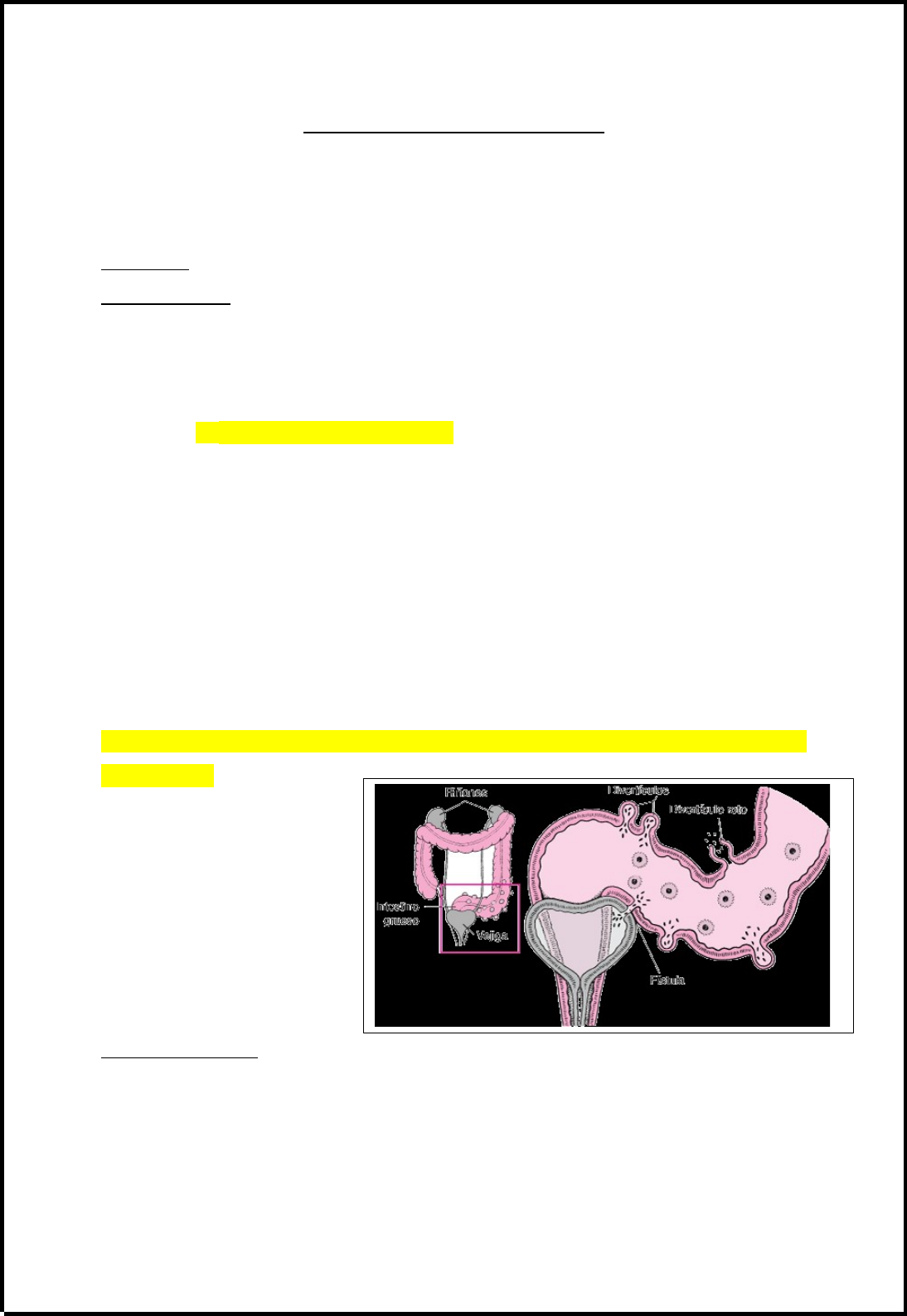 2 Enfermedad Diverticular del Colon La enfermedad diverticular comprende un espectro de escenarios clínicos que incluye desde un estado asintomático hasta una peritonitis con compromiso vital. Concepto: Evaginación del colon. Epidemiología: · Prevalencia de la ED · Menor a un 2 % en < 30 años(raro pero existe, principalmente por enfermedades genéticas). · Mayor del 40 % en > 60 años · 66 % en > 85 años · La diverticulitis aguda es la complicación más frecuente · Entre el 15% y el 30% requiere una intervención quirúrgica · Frecuencia similar entre hombres y mujeres · Diverticulosis es una de las condiciones mas comunes en los países del occidente · Asiáticos menos común afecta colon proximal · Occidentales muy frecuente sigmoides en el segmento mas afectado Asiáticos que adoptan estilos de dieta occidentales aumentan las tasas de diverticulosis. Conceptos Básicos · Divertículo: Es un saco o bolsa anormal, que sobresale de la pared de un organo hueco. Representan en realidad herniaciones de la mucosa a traves del colon, en los lugares por donde las arteriolas penetran en la capa muscular. · Saculación: · Divertículo Verdadero: Todas las capas (divertículo de Meckel) · Divertículo falso: mucosa y submucosa (divertículos del colon) · Diverticulosis presencia de multiples divertículos que son asintomáticos. Ej: pediu ao pct p hacer una colonoscopia y descobriu los divertículos, pero pct no tiene síntomas ningún. · Enfermedad Diverticular divertículo asociado a síntomas; Ej: un divertículo se obstruí, e produce síntomas. · Diverticulitis evidencia de inflamación diverticular (fiebre, taquicardia) con o sin signos y síntomas localizados; · Diverticulitis No Complicada diverticulitis sin perforación; · Diverticulitis Complicada perforación, absceso, fístula u obstrucción. Distribuición · 95% Compromiso sigmoideo-Por el díametro pequeño · 65% Solo sigmoides · 7% Todo el colon En el lado derecho es raro. Etiología Baja fibra en la dieta---Disminuye volumen de heces---Aumenta movimientos de segmentación---Zonas de alta presión intraluminal hasta 90 mmHg---Pulsión mucosa a través muscular---En puntos débiles penetración vasos. Imagine una cobra, cuando ella come hace movimientos de segmentación, y asi hace el colon. Entre segmentación y segmentación aumenta las presiones de ciertos lugares, si el volumen de las heces fecales no son grandes, entonces las segmentaciones y contracciones tiene de ser mucho mas fuerte para que este alimiento se pueda desplazar hacia la parte distal, entonces esto hace que aumente la presión intraluminal, y donde la pared del colon es mas debil que es donde penetra las arteriolas, y hace la herniación. Fisiopatologia Vasos rectos penetran en la pared – áreas de debilidad – Mucosa y submucosa se hernian.(Ele falou o mesmo que esta acima na etiología). El mecanismo de producción es por PULSIÒN. ¿Por qué?: Aumento de presión intracolónica – Fuertes contracciones musculares para hacer avanzar contenido luminal. OTRAS CAUSAS DE LA FISIOPATOLOGIA: · ELASTINA · Más elastina entre células musculares = Acortamiento tenia y formación de racimos del M. Circular. · ¿Quienes pueden tener alterada la elastina? R: Sx Ehlers-Danlos y Sx Marfan(tendencia a producir muchos divertículos de colon). OBS: cuando ya tiene una diverticulitis ya no es ideal comer fibras. Cuadro Clínico Historia Natural de La Enfermedad Divertícular: · Asintomática 70% · Evoluciona a diverticulitis 15–25% ya es una complicación. · Se asocia a sangrado 5–15%(se debe ao roce de las heces fecales aos vasos sanguíneos). Clasificación Clínica · Enfermedad Diverticular Asintomática(70%) · Enfermedad Diverticular Sintomática. · No complicada o simple (75%) · Diverticulitis simple · Complicada (25%) · Diverticulitis · Perforación · Obstrucción · Abscesos(diverticulitis que se perforo y se hizo un plastrón) · Fístula · Hemorragia ENFERMEDAD DIVERTICULAR SINTOMATICA NO COMPLICADA · Malestar o disconforto abdominal en hemiabdomen izquierdo · Flatulencia · Anorexia · Náuseas · Episodios alternantes de estreñimiento y diarrea · Disminución del tamaño de las heces(heces acintadas) · Síntomas y signos indistinguibles de un síndrome de intestino irritable · El tratamiento es médico. ENFERMEDAD DIVERTICULAR COMPLICADA · Dolor abdominal tipo cólico en cuadrante inferior izquierdo · Masa abdominal generalmente en FII o hipogastrio(se formo un Plastrón; se perforó, los órganos alrededor lo envolvieron, entonces se Forma una masa, como un tumor, y eso es muy doloroso). · Signos de irritación peritoneal localizados en estas mismas zonas. · Anorexia, náuseas, vómito · Fiebre · Taquicardia · Leucocitosis(respuesta inflamatoria sistémica). · Distensión o flatulencia que se exacerba al comer y se alivia con el paso de gases o deposiciones(pct cuando come, aumenta dolor, cuando defeca o expulsa gases, mejora mucho). · Sangramiento o test de sangre oculta +Para no se olvidar enfermedad diverticular complicada puede ser: PROCESOS CRÓNICO: FISTULAS Y ESTENOSIS(hace diverticulitis por varias veces e se cura, vai producindo una obstrucion o estenosis); PROCESOS AGUDOS: COLECCIÓN(liquido alrededor desse divertículos), ABSCESOS(pus), PERITONITIS. Casi siempre son cirurgicos. Fístula Que es fistula? Es una comunicación anormal entre dos organos que normalmente no se comunican. · Los abscesos asociados a una diverticulitis conducen a la formacion de fistulas al abrirse dentro de las visceras adyacentes; · Mas frecuente en varones. Tipos de fístulas: -Colovesical 65%(mas fct); -Colouterina 5%; -Colovaginal 25%(en mujeres mas fct…na aula ele disse 75%...); -Coloapendicular. -Coloentéricas 7%; -Colocutáneas; -Coloepidural; -Colovenosa; -Cologástrica; -Coloperineal; -Colosalpingea; -Coloureteral; -Colouterovesical; -Colovesicovaginal; Obstruccion Intestinal · Afecta al 10% de los 