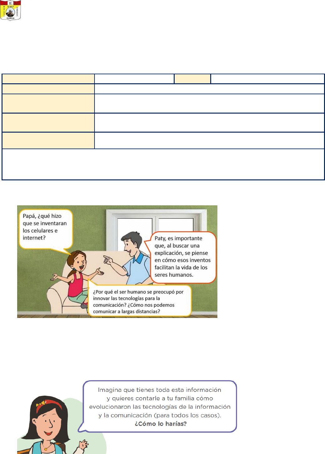 INSTITUCION EDUCATIVA N° 51017 “MARISCAL GAMARRA” DE CUSCO – 6° GRADO Experiencia de aprendizaje 8: “Reflexionamos sobre las tecnologías para el buen vivir” Actividad de la semana 1: Las tecnologías de la información y la comunicación en nuestras vidas. Área Personal Social Fecha Lunes, 20 de setiembre. Actividad de aprendizaje 1.1.Evolución de las tecnologías para la comunicación Propósito Explicar cómo evolucionaron las tecnologías de la información y la comunicación a través de una línea del tiempo. Recursos y/o materiales Ficha, celular, hojas de reúso, fichas informativas de Aprendo en casa, etc. Evidencia y/o producto Explicar cómo evolucionaron las tecnologías de la información y la comunicación, sobre la base de fuentes confiables. CRITERIOS DE EVALUACIÓN Explica, con base en información confiable, cómo evolucionaron las TIC, y las relaciona con su utilidad en la educación y la salud. 1. Veamos el siguiente diálogo: Paty quedó con mucha curiosidad y comenzó a pensar en los cambios que se han producido a partir de los inventos. 2. Para encontrar respuestas, Paty buscó información en internet. En fichas, anotó cada dato que consideró importante. Te invitamos a leer la información que halló Paty. INSTITUCION EDUCATIVA N° 51017 “MARISCAL GAMARRA” DE CUSCO – 6° GRADO Fichas de información sobre los inventos relacionados con las tecnologías de la información y la comunicación: 3. En una hoja aparte, ordena estos hechos en forma cronológica, con ayuda de las imágenes sobre los principales inventos de las tecnologías de la información y la comunicación. Recorta las imágenes del ANEXO 1 y ordena de manera cronológica. Toma en cuenta el nacimiento de Cristo para ubicarte a.C y d.C. Nacimiento de Cristo INSTITUCION EDUCATIVA N° 51017 “MARISCAL GAMARRA” DE CUSCO – 6° GRADO El 5 de agosto de 2010, 33 mineros quedaron atrapados cuando colapsó la mina San José, en Chile. Durante 70 días se comunicaron por medio de cartas, luego mensajes y, finalmente, contacto telefónico a través de un cable llamado “paloma”. El médico que los atendía grababa música para ellos en iPod e, incluso, aceptaba peticiones especiales. Les instaba a bajar de peso para que puedan caber en la cápsula “Fénix” que finalmente los recató. Esta comunicación se pudo realizar gracias al avance de las tecnologías de la información y la comunicación. 4. Observa cómo quedaron ordenados, luego selecciona 5 de ellos, en orden de más antiguo a más reciente, y completa la siguiente tabla: Invento ¿Cómo utilizaban en la comunicación este invento? 1 000 a.C Primer servicio postal El primer servicio de correos enviaba paquetes y cartas con mensajeros a caballo. Los antiguos Egipcios, Griegos y Romanos se comunicaban con palomas mensajeras. El mensaje se ataba a una de las patas de la paloma. 1400 Imperio Incaico El chaski Permitió la difusión en masa de los libros 1 830 (EE.UU) El telégrafo 5. Lee atentamente el caso y responde las preguntas: INSTITUCION EDUCATIVA N° 51017 “MARISCAL GAMARRA” DE CUSCO – 6° GRADO El ser humano es un ser social. La comunicación, por lo tanto, es vital en su desarrollo. Por ello, siempre está en la búsqueda de mejorarla, valiéndose de la tecnología. Seguramente estás pensando cómo la comunicación puede ayudar en el contexto que se está viviendo y cuánta información se puede compartir ahora con mayor facilidad. 6. De acuerdo a la información dada, identifica los problemas, y completa la tabla a continuación: Problema Hechos ¿Qué les ayudó? Inventos que se identifican Uso que se les dio Los mineros quedaron atrapados Forma de comunicación 7. Con base en lo analizado, responde la siguiente pregunta: Si este hecho hubiese ocurrido en el año 776 a. C., cuando se usaban las palomas mensajeras para llevar y traer mensajes, aprovechando su capacidad de orientación para regresar a su lugar de origen, ¿de qué manera hubiese ayudado su uso en el caso de los mineros? 8. A continuación, completa la tabla citando un ejemplo de la utilidad de estos descubrimientos para la salud y la educación. Utilidades de las TIC Antes Ahora Educación Salud INSTITUCION EDUCATIVA N° 51017 “MARISCAL GAMARRA” DE CUSCO – 6° GRADO Asume tus compromisos: 9. Conversa con los integrantes de tu familia y explícales la evolución de las tecnologías de la información y la comunicación a partir del análisis realizado en esta experiencia, resaltando los fines que tuvo. Luego, invítalos a responder lo siguiente: ¿De qué manera las tecnologías de la información y la comunicación nos ayudan a enfrentar desafíos en el estudio, en los quehaceres del hogar, en el trabajo y en el juego? Recoge sus opiniones y tomen acuerdos sobre el uso de estas tecnologías para el bienestar de la familia. ¡BUEN TRABAJO! “Promoción Bicentenario” INSTITUCION EDUCATIVA N° 51017 “MARISCAL GAMARRA” DE CUSCO – 6° GRADO Anexo 1