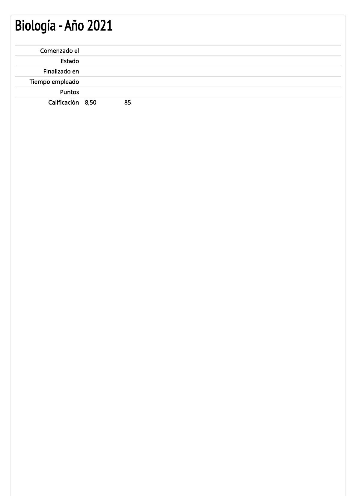 Comenzado el Friday, 4 de June de 2021, 01:37 Estado Finalizado Finalizado en Friday, 4 de June de 2021, 01:46 Tiempo empleado 9 minutos Puntos 17,00/20,00 Cali�cación 8,50 de 10,00 (85%) Biología - Año 2021 Pregunta 1 Correcta Puntúa 1,00 sobre 1,00 Elegí la opción correcta teniendo en cuenta las características de los lípidos que te presentamos en el siguiente panel, donde podés observar la diversidad estructural que presentan estas biomoléculas. Seleccione una: A. Los lípidos I, II, V, VI y VIII son lípidos insaponi�cables. En particular el compuesto I es un triglicérido formado por ácidos grasos saturados, encontrándose por lo tanto en estado sólido a temperatura ambiente. B. Los lípidos I, II, V, VI y VIII son lípidos saponi�cables. En particular el compuesto I es un componente de la membrana plasmática C. Los lípidos I, II, V, VI y VIII son lípidos saponi�cables. En particular el compuesto I es un triglicérido formado por ácidos grasos saturados, encontrándose por lo tanto en estado sólido a temperatura ambiente. D. Los lípidos I, II, V, VI y VIII son lípidos saponi�cables. En particular el compuesto I es un triglicérido formado por ácidos grasos saturados, encontrándose por lo tanto en estado líquido a temperatura ambiente. E. Los lípidos I, II, V, VI y VIII son lípidos saponi�cables. En particular el compuesto II es un triglicérido que cumple una función principal de reserva energética. Respuesta correcta La respuesta correcta es: Los lípidos I, II, V, VI y VIII son lípidos saponi�cables. En particular el compuesto I es un triglicérido formado por ácidos grasos saturados, encontrándose por lo tanto en estado sólido a temperatura ambiente. Pregunta 2 Correcta Puntúa 1,00 sobre 1,00 La siguiente imagen representa la molécula de un ácido graso en la que se identi�caron dos regiones con los números 1 y 2. Indique la opción correcta. Seleccione una: A. Ambas regiones son hidrofóbicas. B. La región 1, es un grupo carboxilo (hidrofóbico) y la 2 es una cadena hidrocarbonada (hidrofílica). C. La región 1, es un grupo carboxilo (hidrofílico) y la 2 es una cadena hidrocarbonada (hidrofóbica). D. La presencia de 1 (un grupo polar) hace que la molécula sea soluble en agua. E. Ambas regiones son hidrofílicas. Respuesta correcta La respuesta correcta es: La región 1, es un grupo carboxilo (hidrofílico) y la 2 es una cadena hidrocarbonada (hidrofóbica). Pregunta 3 Correcta Puntúa 1,00 sobre 1,00 Pregunta 4 Correcta Puntúa 1,00 sobre 1,00 Dados los siguientes ácidos grasos de 18 C: I- CH (CH ) COOH II- CH (CH2) CH=CH(CH ) COOH III- CH (CH ) CH=CHCH CH=CH(CH ) COOH Elegí la opción correcta: Seleccione una: A. El compuesto III presenta el mayor punto de fusión debido a la presencia de dos insaturaciones. B. El compuesto I presenta el mayor punto de fusión debido a que no presenta insaturaciones. C. Como II presenta sólo una insaturación y III presenta dos, el compuesto II presenta un punto de fusión mayor que el III. D. B y C son correctas E. Ninguna es correcta Respuesta correcta La respuesta correcta es: B y C son correctas Señalá la opción correcta respecto a los lípidos: Seleccione una: A. El aceite comestible, al ser de origen vegetal, no posee colesterol B. El aceite contiene ácidos grasos saturados C. Los ácidos grasos saturados poseen enlaces dobles entre sus átomos de carbono D. A temperatura ambiente, los ácidos grasos insaturados se encuentran en estado sólido E. Ninguna es correcta Respuesta correcta La respuesta correcta es: El aceite comestible, al ser de origen vegetal, no posee colesterol 3 2 16 3 7 2 7 3 2 4 2 2 7 Pregunta 5 Correcta Puntúa 1,00 sobre 1,00 Pregunta 6 Correcta Puntúa 1,00 sobre 1,00 Señalá la opción correcta respecto a los lípidos: Seleccione una: A. Los ácidos grasos forman gotas en un medio acuoso B. El colesterol, además de ser un componente esencial de las membranas en células animales, es precursor de biomoléculas tales como vitamina D, hormonas esteroideas y ácidos biliares C. Los fosfolípidos son lípidos neutros que constituyen el principal componente de las membranas biológicas D. Todos los triglicéridos son líquidos a temperatura ambiente y se los denomina aceites E. Los fosfolípidos en un medio acuoso tienen la capacidad de formar micelas Respuesta correcta La respuesta correcta es: El colesterol, además de ser un componente esencial de las membranas en células animales, es precursor de biomoléculas tales como vitamina D, hormonas esteroideas y ácidos biliares Los polisacáridos están formados por largas cadenas de azúcares simples unidos por enlaces O-glicosídicos. Leé las siguientes premisas y determiná cuál es la correcta. Seleccione una: A. La celulosa es un heteropolisacárido que no es digerido por los humanos ya que son incapaces de hidrolizar sus enlaces glicosídicos B. El almidón es un homopolisacárido constituido por un polímero lineal (amilosa) y otro rami�cado (amilopectina) que cumple función de reserva energética en animales C. El glucógeno y el almidón son hidrofóbicos D. Los glucógenos tiene una estructura similar a la amilopectina pero es más rami�cado. E. El glucógeno es un heteropolisacárido rami�cado de reserva, se acumula en hepatocitos y músculo esquelético Respuesta correcta La respuesta correcta es: Los glucógenos tiene una estructura similar a la amilopectina pero es más rami�cado. Pregunta 7 Incorrecta Puntúa 0,00 sobre 1,00 Pregunta 8 Correcta Puntúa 1,00 sobre 1,00 Elegí la opción que justi�ca la siguiente a�rmación: El colibrí acumula sus reservas bajo la forma de grasa y no en forma de hidratos de carbono ya que: Seleccione una: A. Los triglicéridos son una fuente de energía más e�ciente que los hidratos de carbono, ya que al estar más reducidos se obtiene más energía al producirse su oxidación. Además, son hidrofílicos evitando el peso extra por el agua de hidra