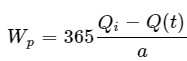 Onde Wp é volume anual (m³), Qi é a vazão inicial do poço (m³/dia) e Q(t) é a vazão em função do tempo (m³/dia), dado por: