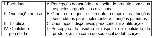 Para o consumidor, quando em um produto ou serviço não são encontrados defeitos e existem atributos que agregam valor, este passa a ter a condição de “produto com qualidade”. Baseado nesse contexto, leia as afirmativas a seguir e associe as colunas.