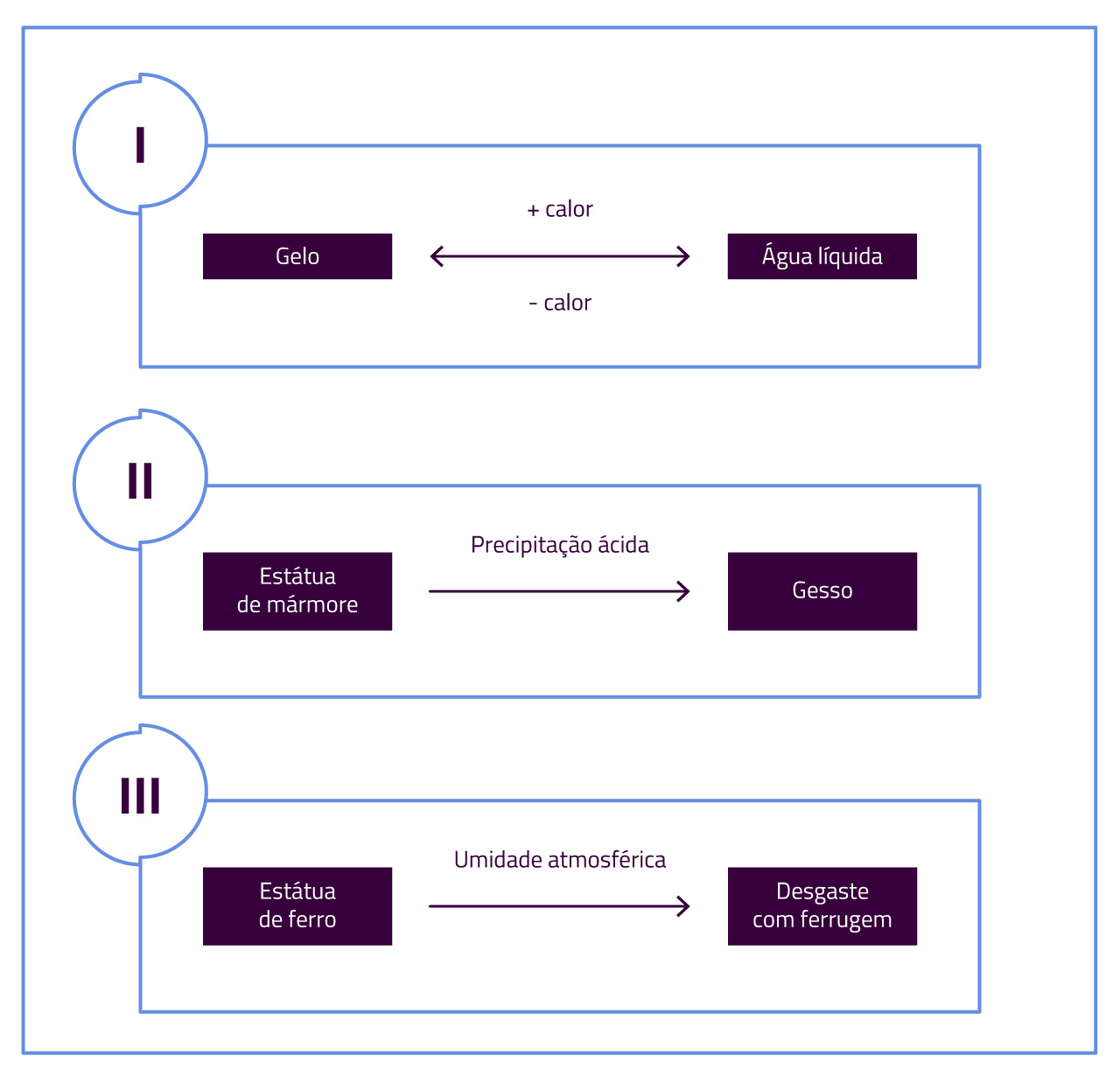As Figuras I, II e III referem-se a fenômenos químicos. Não há fenômenos físicos.