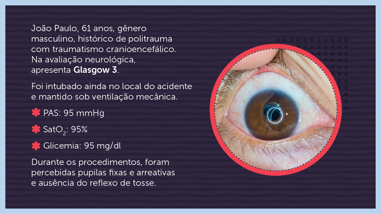 Após conhecer o histórico e o diagnóstico de admissão do paciente, e ter a informação de que ele já se encontra nesse estado por um período superior a 48 horas, a equipe de atendimento começa a suspeitar de uma possível lesão cerebral que evoluiu para morte encefálica (ME). Com essa suspeita, para o diagnóstico completo, deverão ser realizados dois testes clínicos por profissionais diferentes (preferencialmente neurologistas).