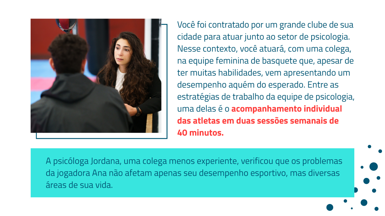 A clínica psicoterápica é uma das áreas mais tradicionais de atuação do profissional da psicologia. No entanto, a clínica do esporte diferencia-se da prática psicoterápica por ter o foco nas práticas esportivas. Portanto, como contratada do clube, não é função de Jordana trabalhar os demais aspectos da vida de Ana. Porém, ela pode sugerir que Ana busque uma psicoterapia individual, caso queira buscar ajuda para outros aspectos de sua vida que também estão sendo afetados, além de sua prática profissional no esporte.