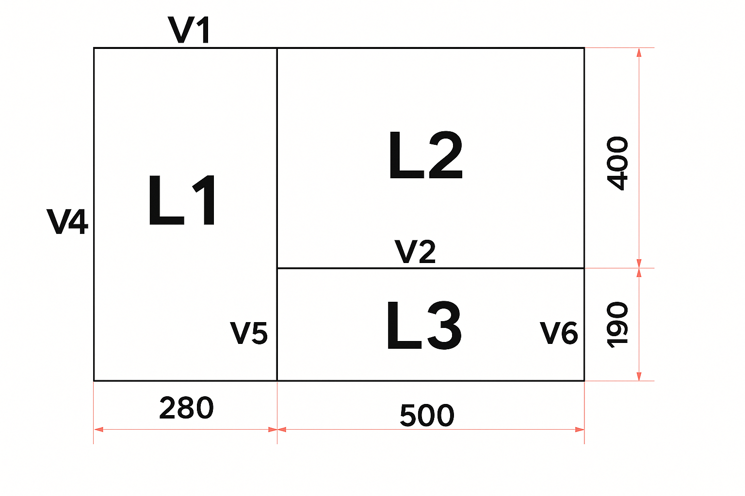 O croqui esquematizado a seguir considera a composição de três lajes de cobertura dispostas em uma edificação localizada em um centro urbano. Os traçados preliminares das lajes e vigas, bem como as suas dimensões e vãos teóricos, também podem ser visualizados.