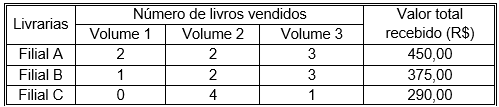 Uma livraria pretende realizar um levantamento a respeito das vendas dos três volumes de um livro de literatura estrangeira em três de suas filiais, buscando analisar a necessidade da aquisição de novos exemplares devido à demanda.