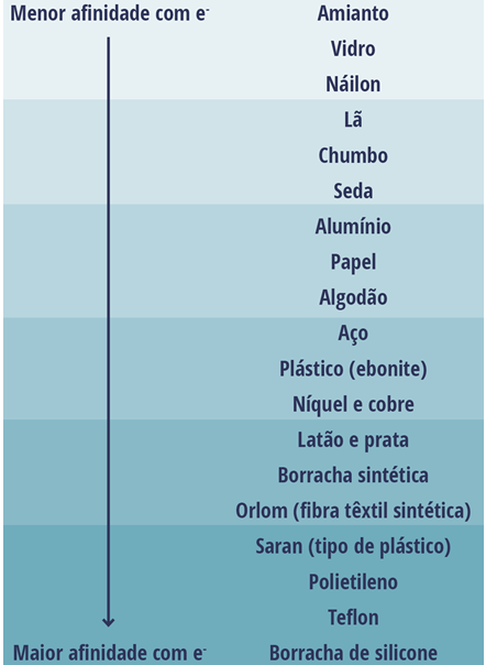 A seguir tem-se um exemplo da série triboelétrica, em que a afinidade por carga negativa aumenta de cima (menor afinidade) para baixo (maior afinidade).