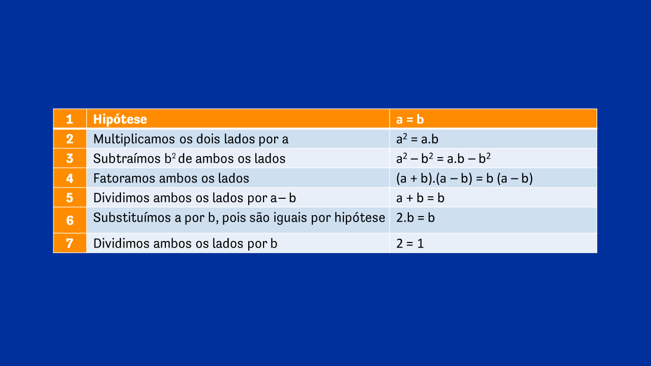 Assim, acabamos de "provar" que 2 = 1. Sabemos que essa afirmação é falsa. Então, onde está o erro da demonstração?